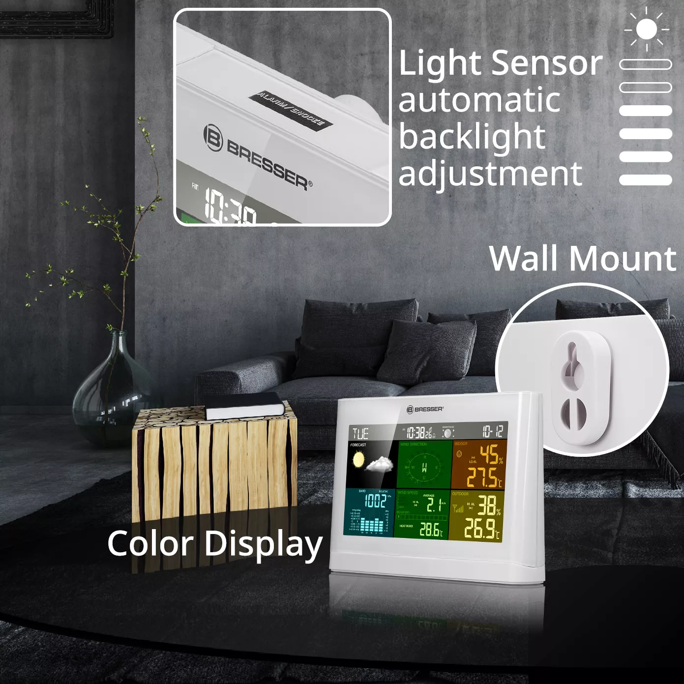 Ein schlechtes Raumklima birgt besonders für Kinder und ältere Menschen häufig Gesundheitsrisiken. Auch hierfür bietet die BRESSER 5-in-1 Comfort Wetterstation mit Farbdisplay ein smartes Feature an. Der Raumklima-Indikator informiert mittels Symbol stets über das Raumklima.
