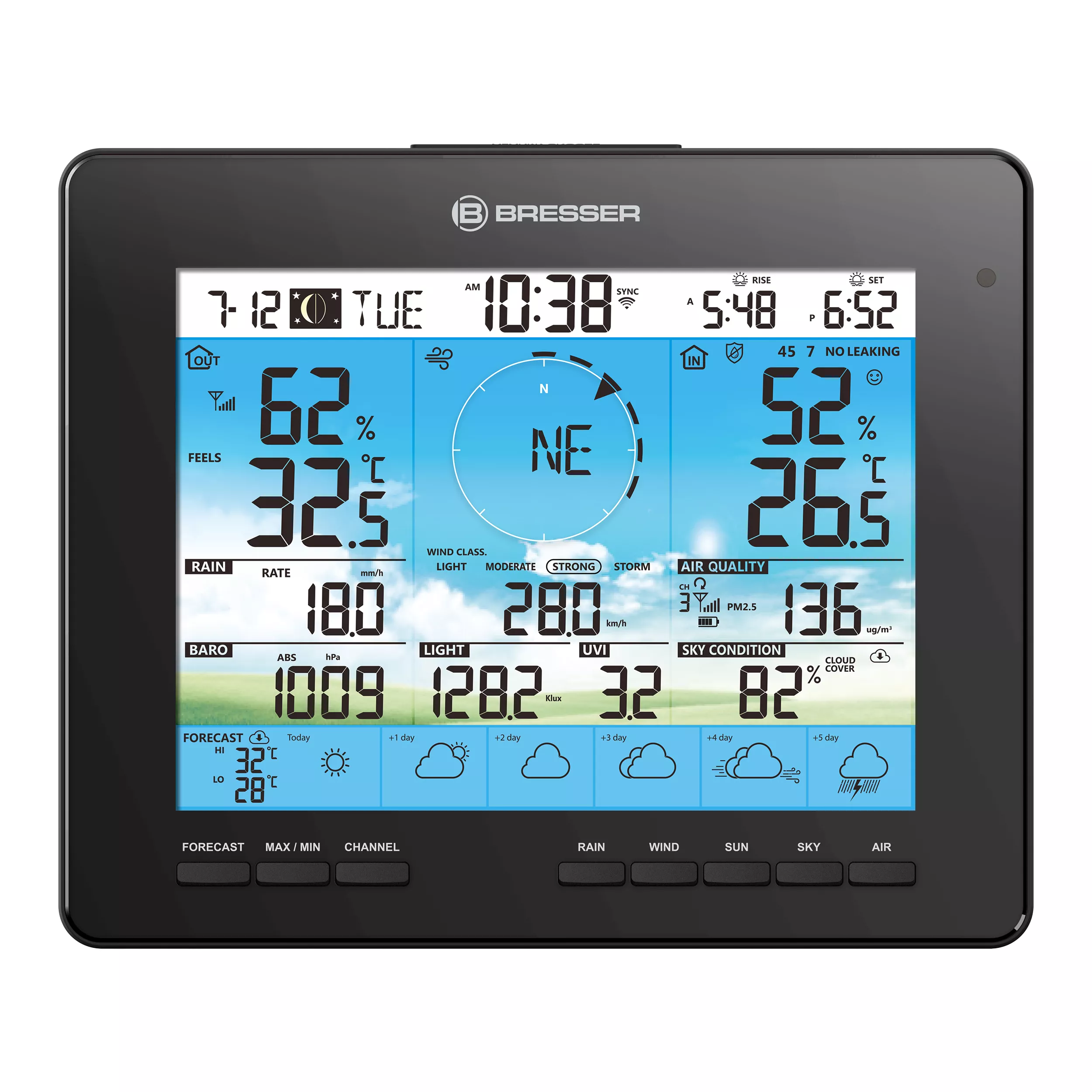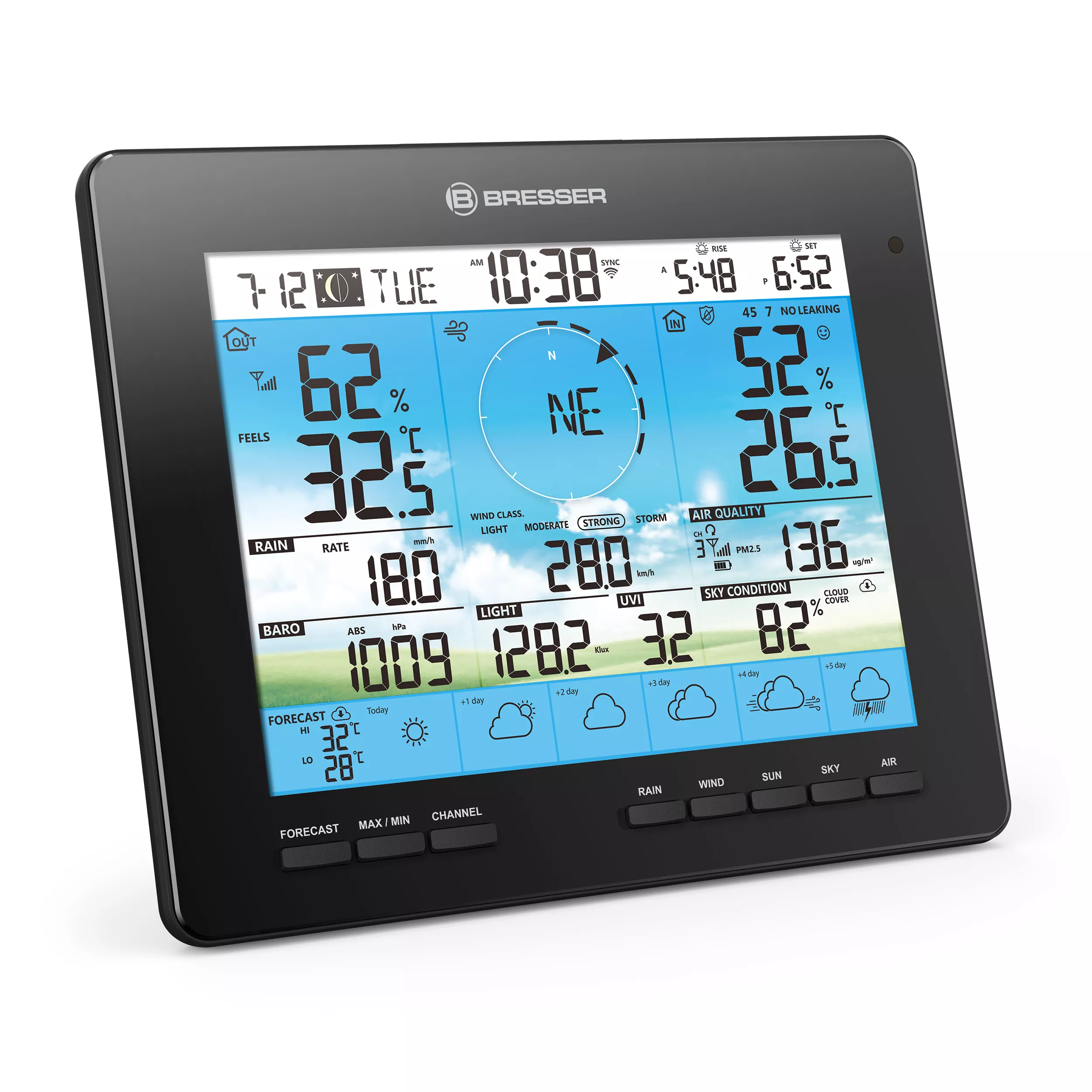 Mit der BRESSER 6-Tage 4CAST PRO WLAN-Wetterstation 7-in-1 solar verschwinden meteorologische Überraschungen ganz schnell von der Bildfläche. Ersetzt werden sie auf dem schicken Farbdisplay unter anderem durch eine zuverlässige Wettervorhersage für 6 Tage. Dafür werden alle nötigen Daten von der Plattform ProWeatherLive über das Internet an die WLAN-Wetterstation mit Solarbetrieb übertragen und als grafisches Symbol dargestellt. Toller Zusatz für mehr Wetterdurchblick: die Anzeige der lokalen Sichtverhältnisse und Bewölkung vom ProWeatherLive-Server.