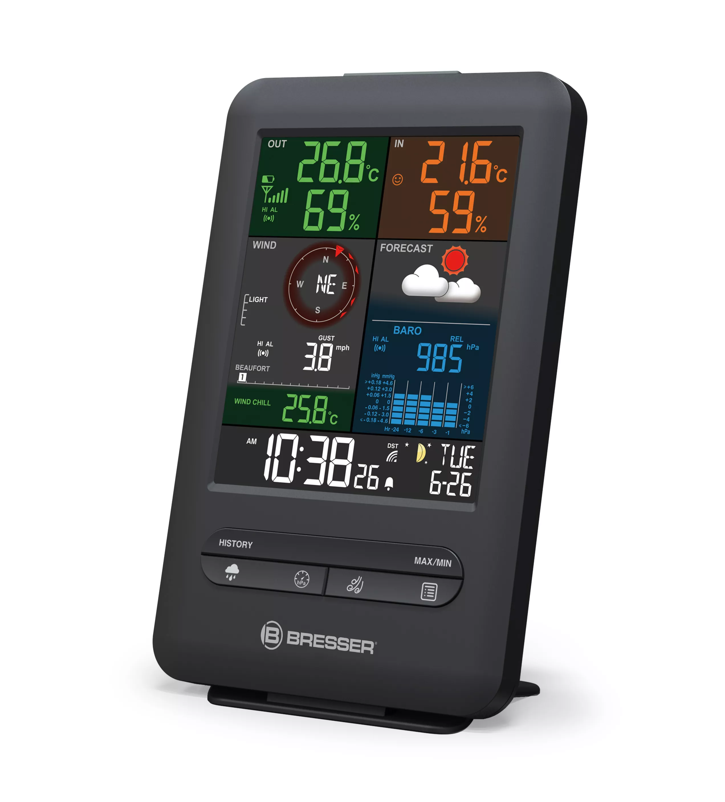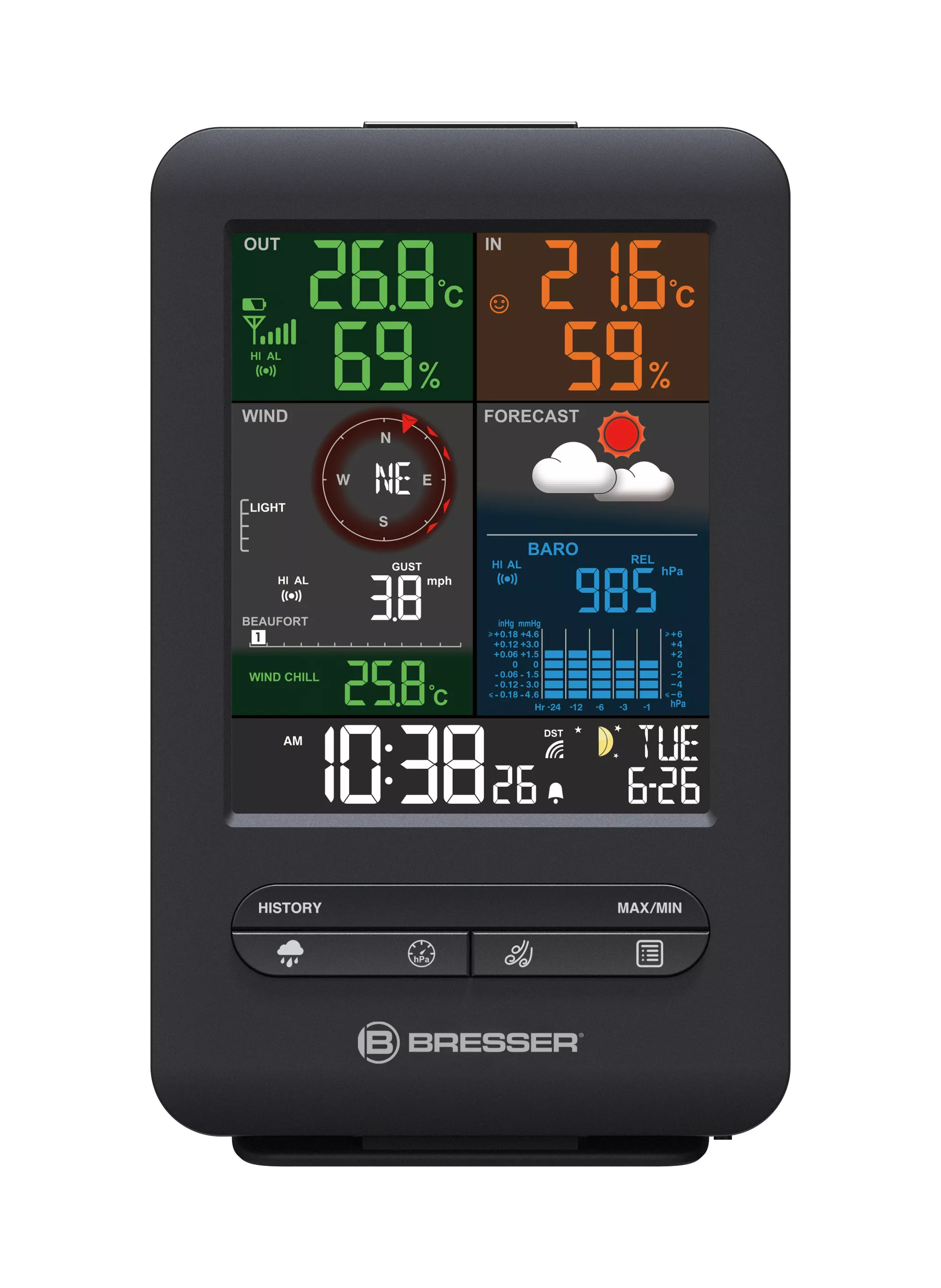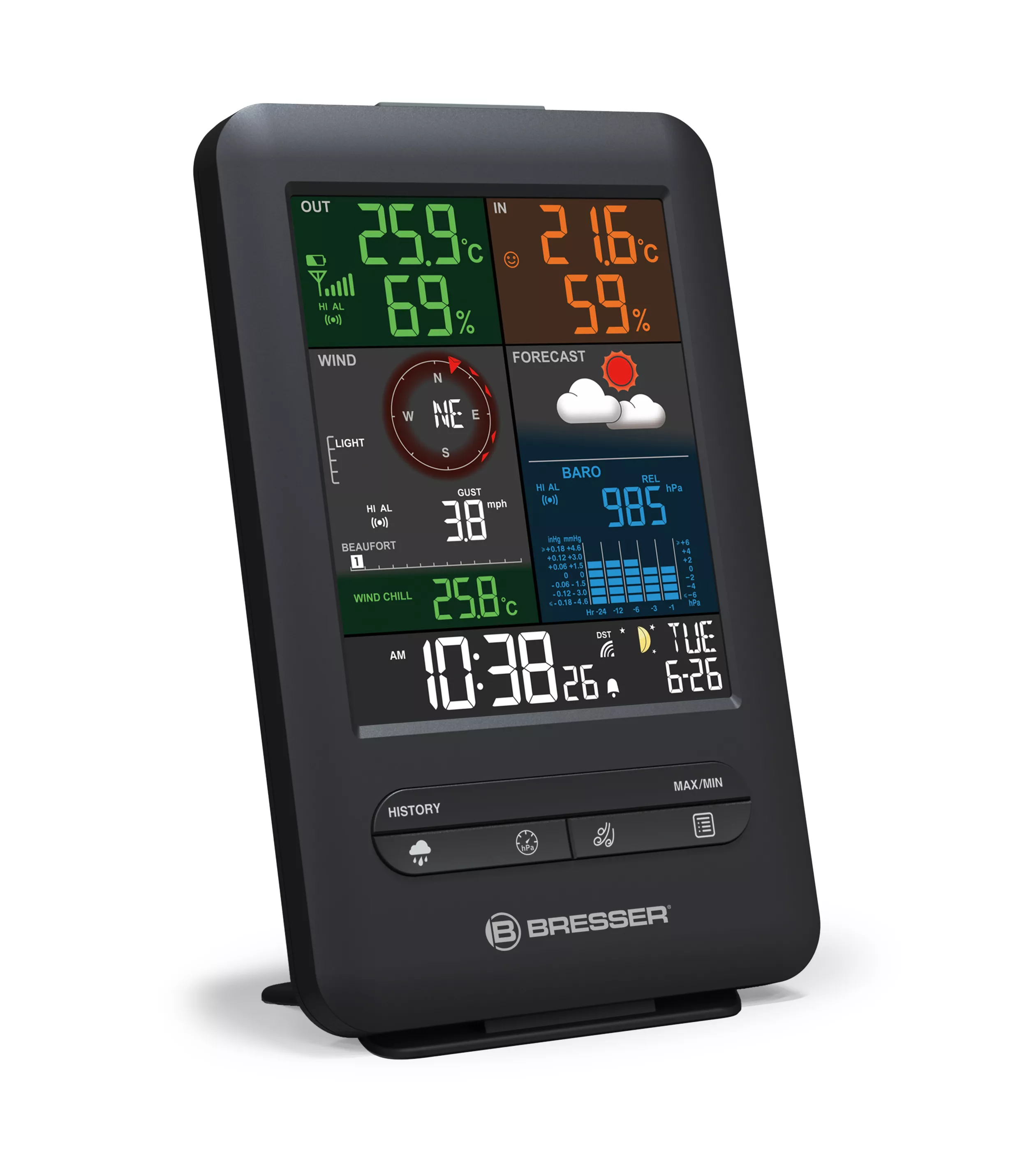 Wozu eine Zusatz-Basisstation? Im Wohnzimmer oder Hausflur freuen sich doch direkt alle Familienmitglieder über die Messwerte Ihrer vorhandenen BRESSER Wetterstation 5-in-1 Beaufort. Die Anzeige der Temperatur, Luftfeuchtigkeit, Luftdruck, Windrichtung und -geschwindigkeit, Niederschlagsmenge sowie der grafischen Wettervorhersage lässt Ihre Lieben wettertauglich durchs Leben gehen. Und durch die Uhr mit Datumsanzeige, Wochentag und Mondphasen verliert bestimmt niemand mehr unnötig Zeit.