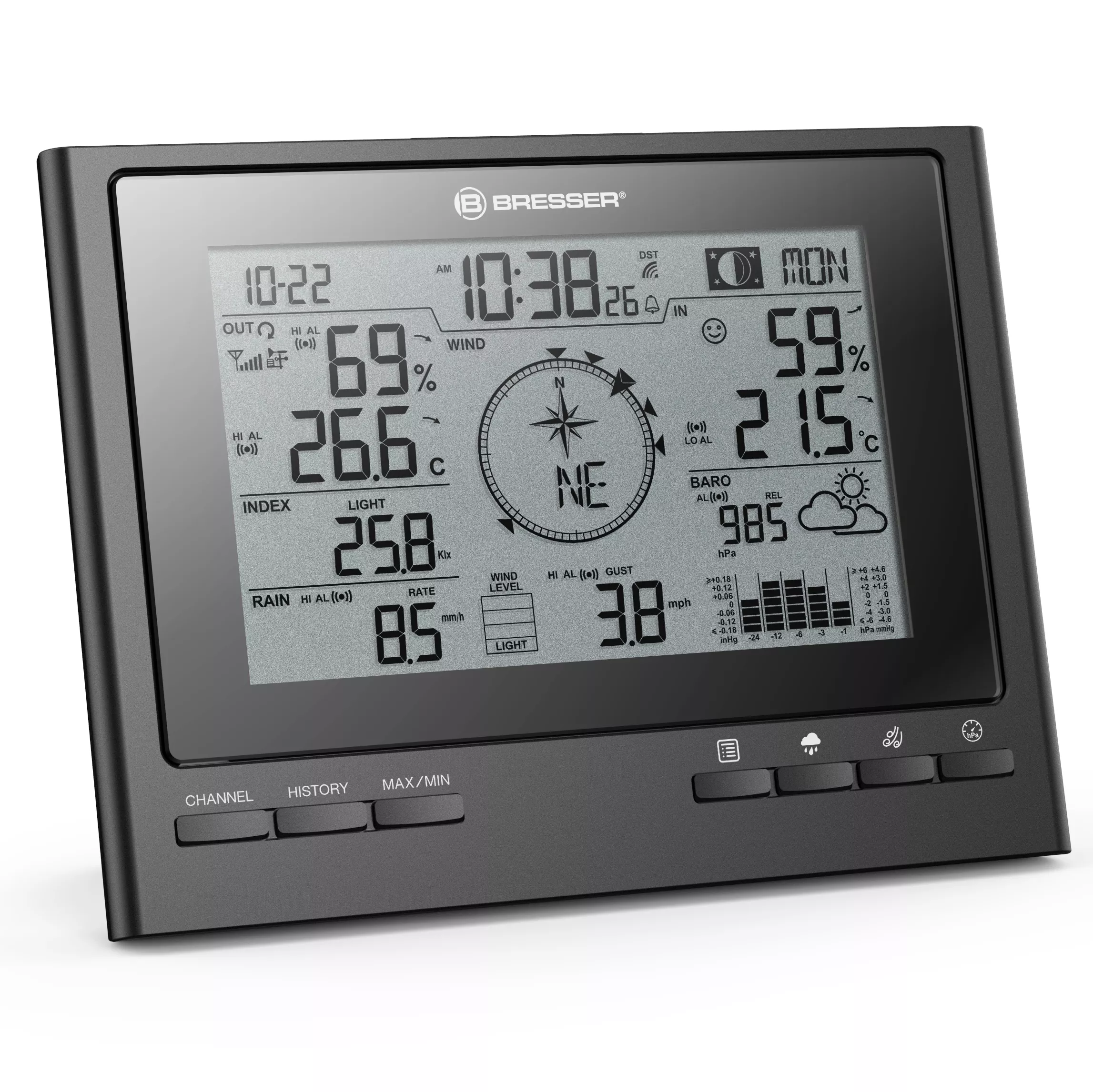 Mit Ihrer vorhandenen 7-in-1 Wetterstation ClimateScout sind Sie schon auf Wolke sieben? Ob Sie's glauben oder nicht: Mit dieser zusätzlichen Basisstation geht es noch ein Stück höher in den Wetter-Himmel. Denn warum die tollen Funktionen und Wetteranzeigen nur in einem einzigen Raum nutzen? Brauche ich die Messwerte meines bereits vorhandenen Außensensors im Schlafzimmer, um morgens mit nur einem Griff in den Kleiderschrank das wettermäßig passende Outfit in der Hand zu halten? Oder sollen im Wohnzimmer alle Familienmitglieder mit einem kurzen Blick auf Außentemperatur, Außenluftfeuchtigkeit, Windgeschwindigkeit, Windrichtung, Niederschlagsmenge, UV- und Lichtintensität ihre eigenen Wetter-Schlüsse ziehen dürfen? Keine Frage mehr: Mit einer Zusatz-Basisstation wissen Sie in beiden Räumen blitzschnell, woher der lokale Wetter-Wind weht. Dazu fügt sie sich mit ihrem schlicht eleganten Design, das extra für BRESSER entwickelt wurde, in jeden Einrichtungsstil dezent ein.