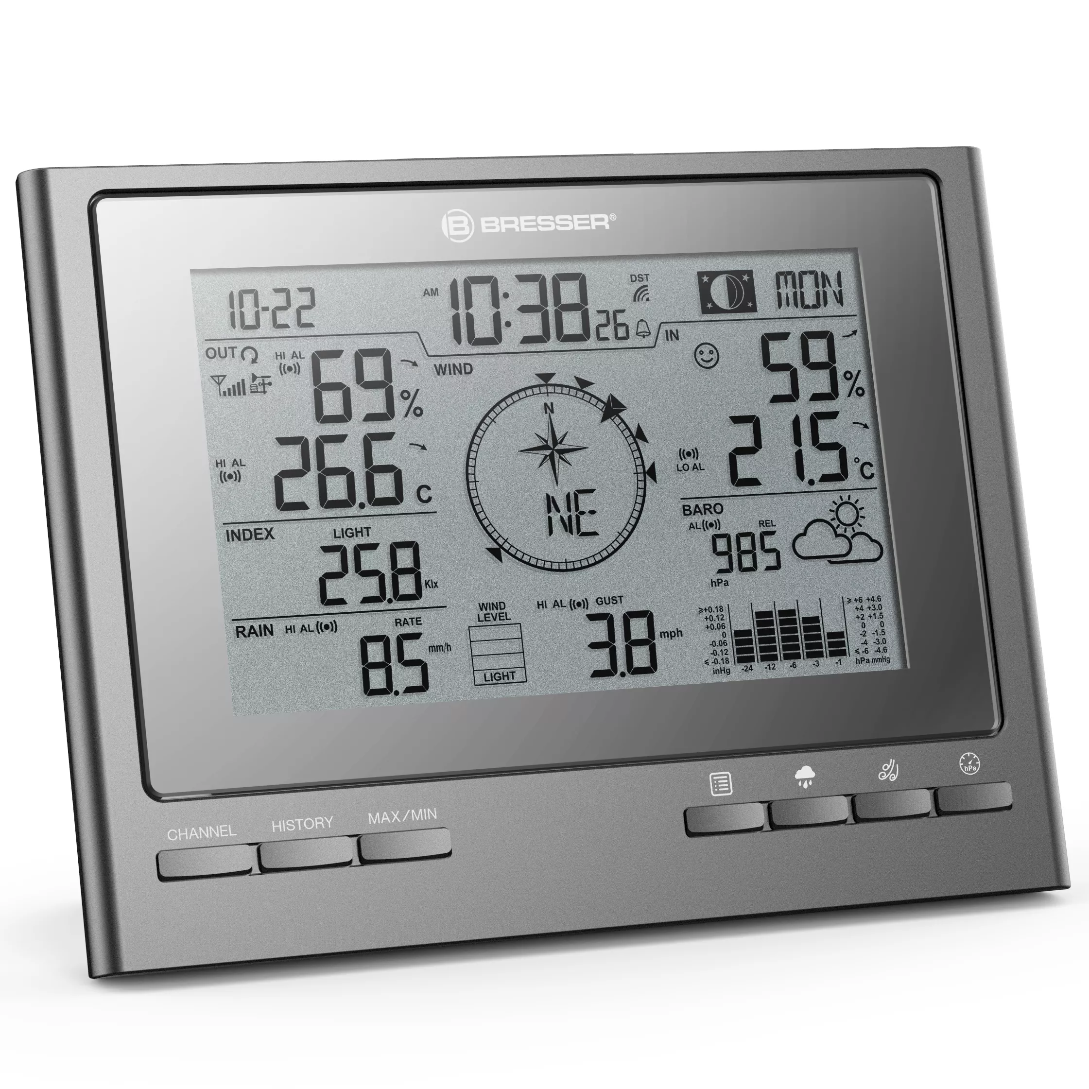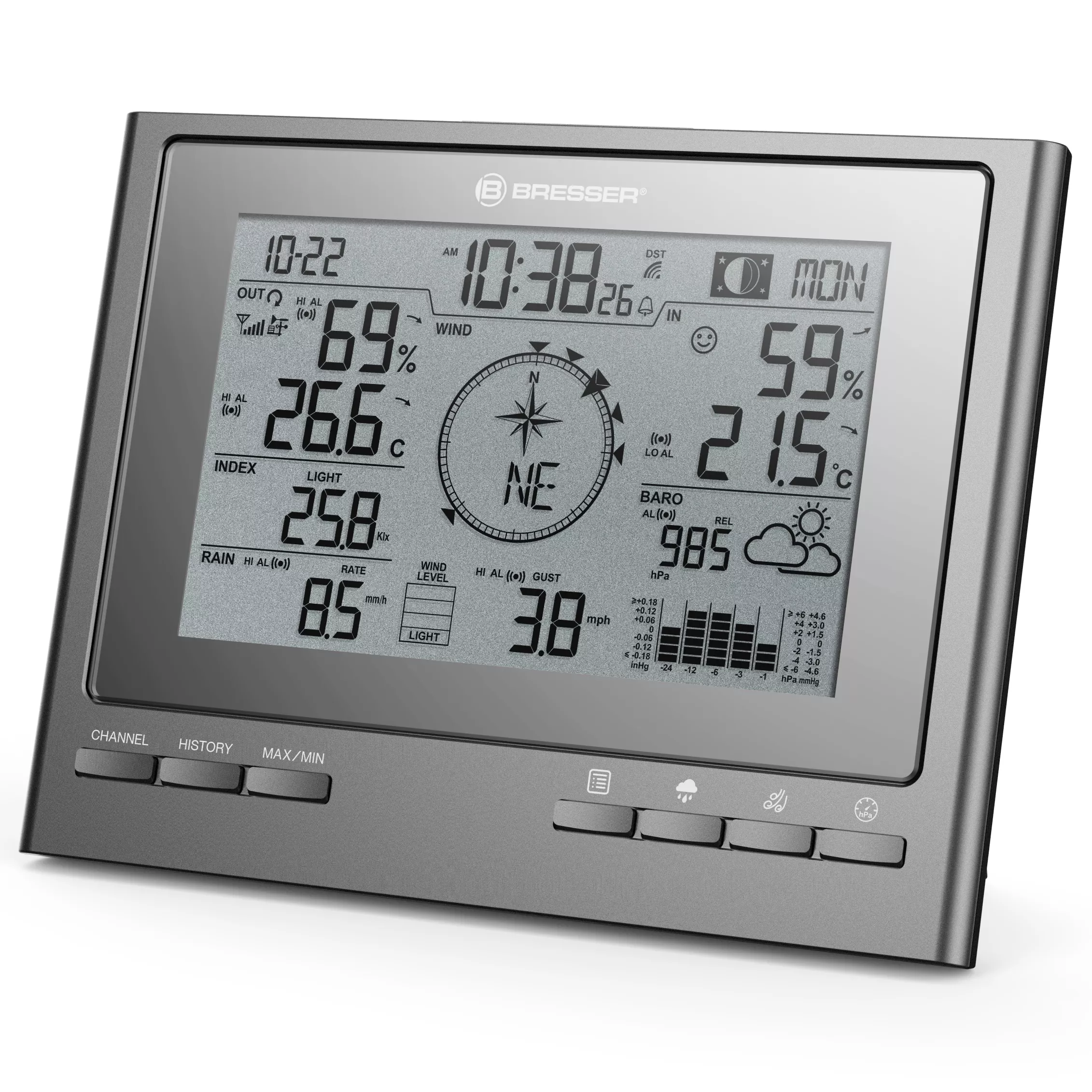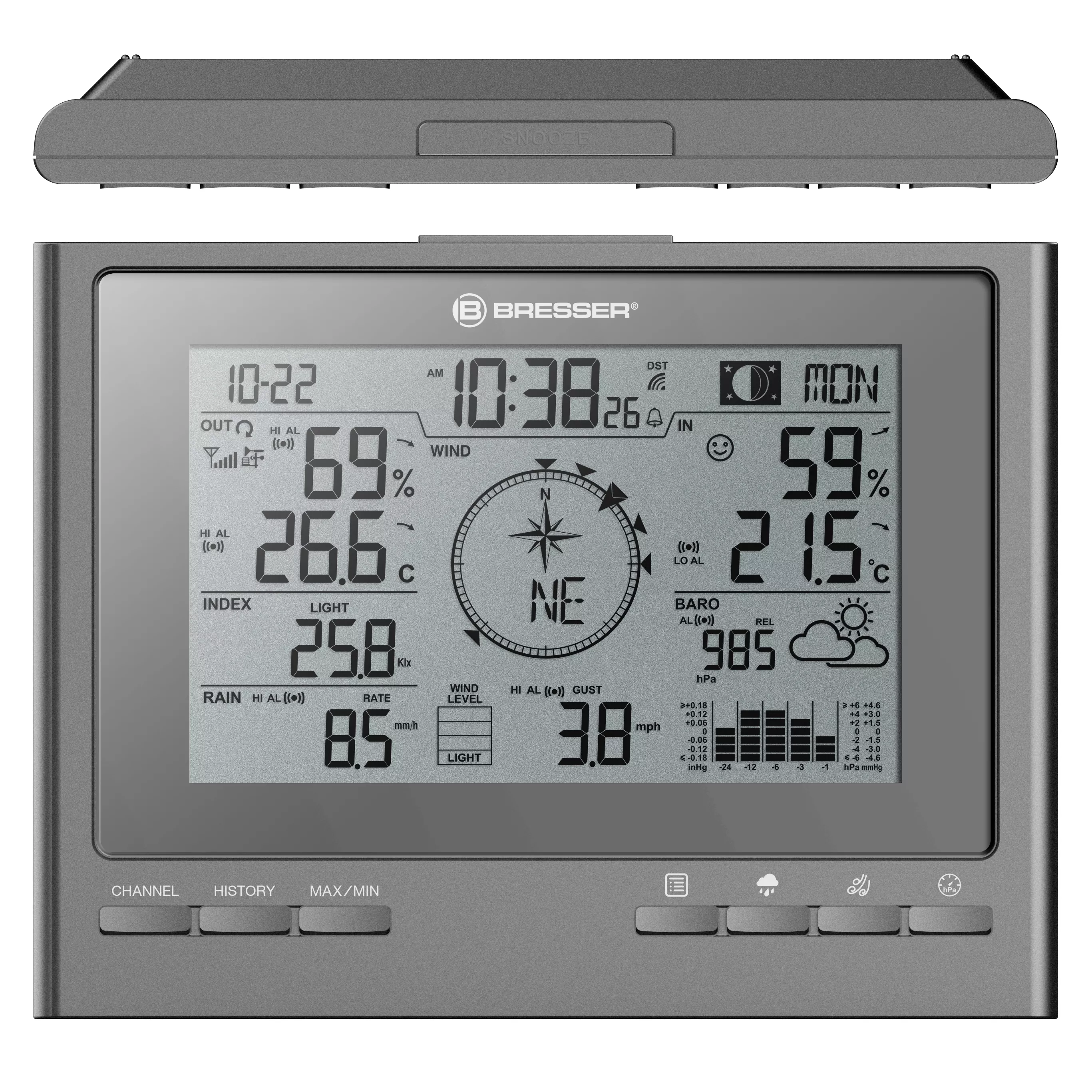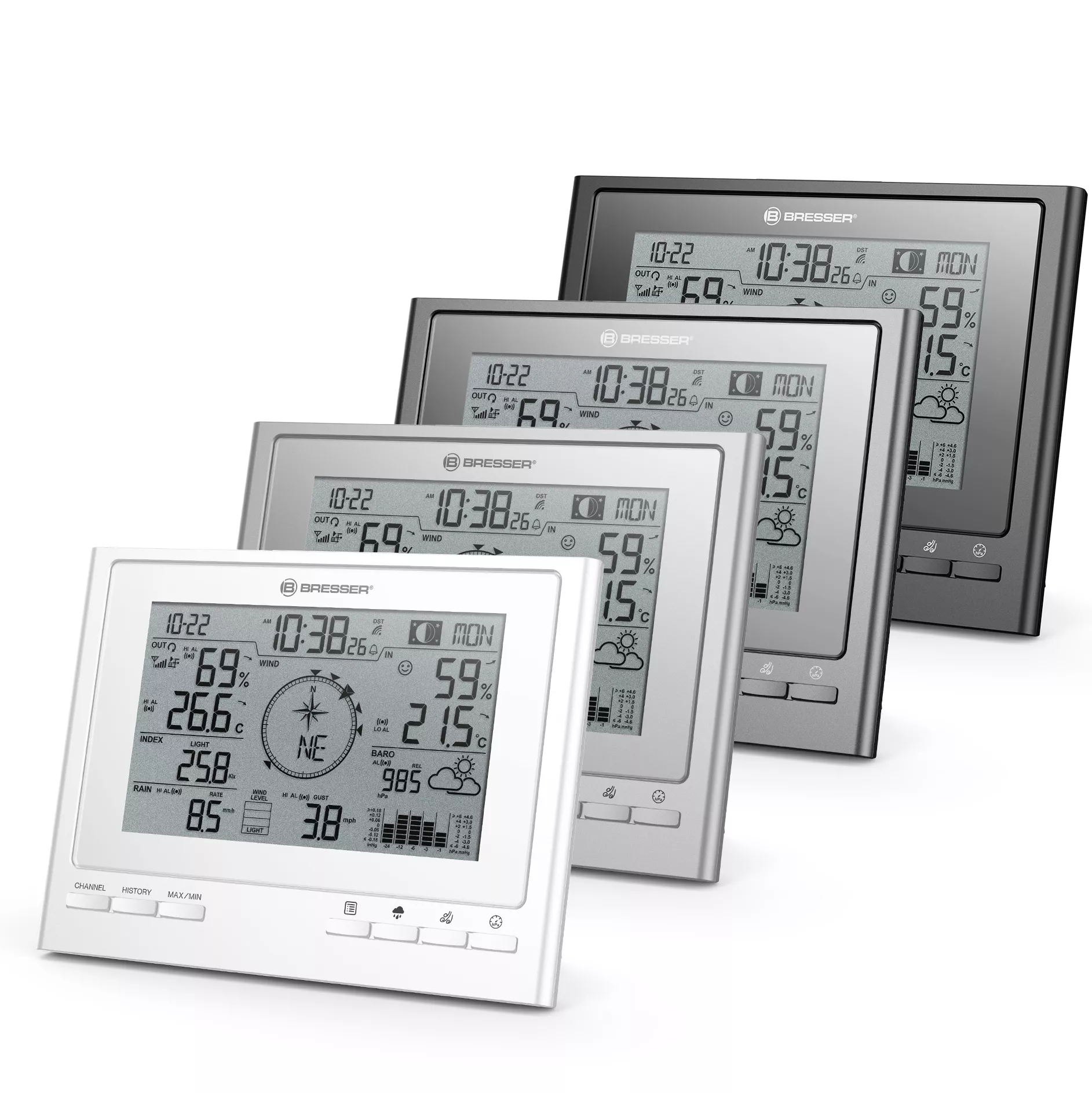 Mit Ihrer vorhandenen 7-in-1 Wetterstation ClimateScout sind Sie schon auf Wolke sieben? Ob Sie's glauben oder nicht: Mit dieser zusätzlichen Basisstation geht es noch ein Stück höher in den Wetter-Himmel. Denn warum die tollen Funktionen und Wetteranzeigen nur in einem einzigen Raum nutzen? Brauche ich die Messwerte meines bereits vorhandenen Außensensors im Schlafzimmer, um morgens mit nur einem Griff in den Kleiderschrank das wettermäßig passende Outfit in der Hand zu halten? Oder sollen im Wohnzimmer alle Familienmitglieder mit einem kurzen Blick auf Außentemperatur, Außenluftfeuchtigkeit, Windgeschwindigkeit, Windrichtung, Niederschlagsmenge, UV- und Lichtintensität ihre eigenen Wetter-Schlüsse ziehen dürfen? Keine Frage mehr: Mit einer Zusatz-Basisstation wissen Sie in beiden Räumen blitzschnell, woher der lokale Wetter-Wind weht. Dazu fügt sie sich mit ihrem schlicht eleganten Design, das extra für BRESSER entwickelt wurde, in jeden Einrichtungsstil dezent ein.