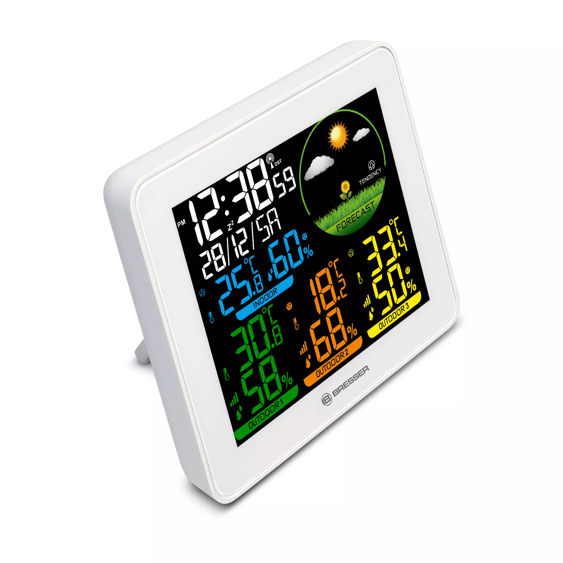Entdecken Sie die BRESSER Farbwetterstation mit 3 Außensensoren und genießen Sie den vollen Überblick über Wetter und Raumklima an verschiedenen Standorten!