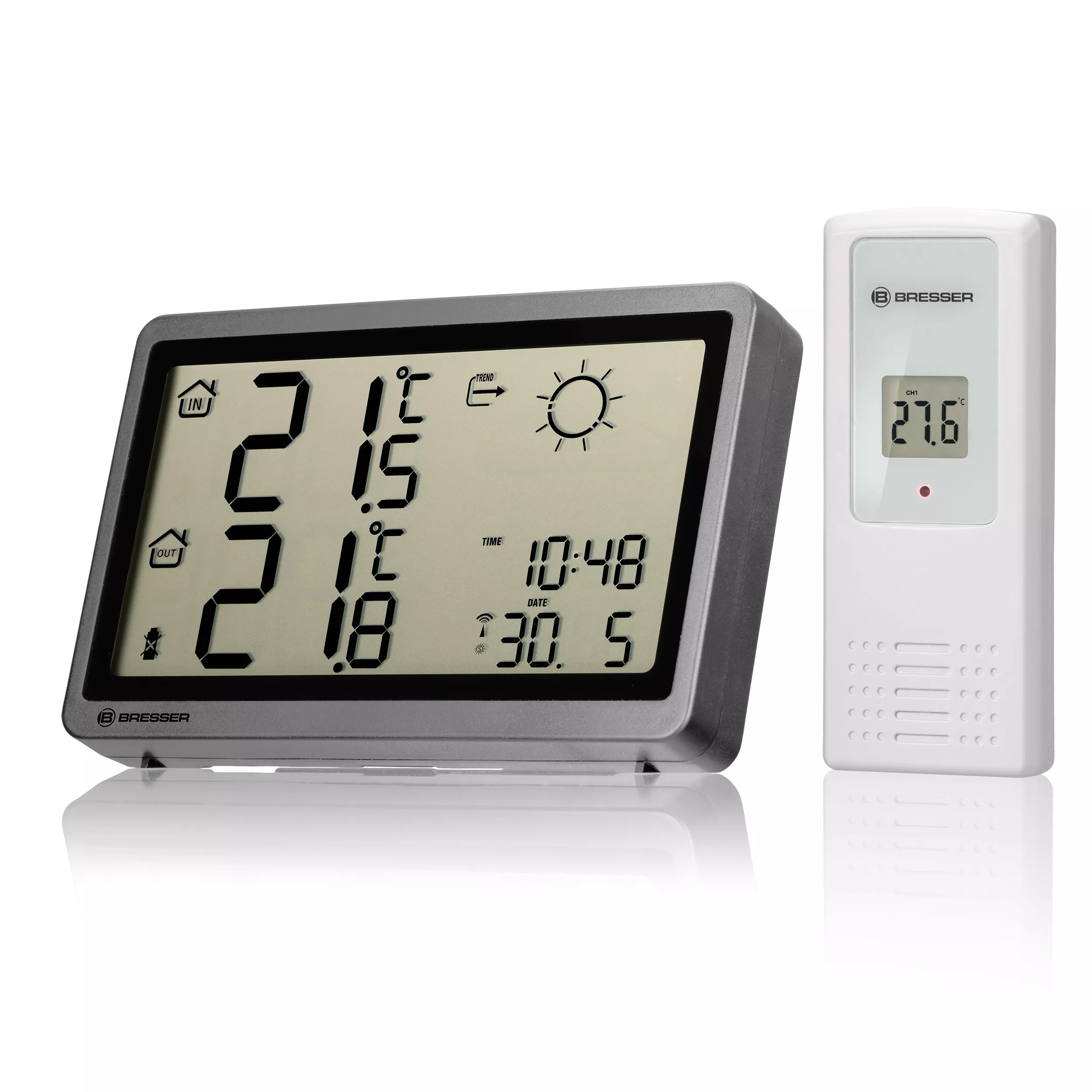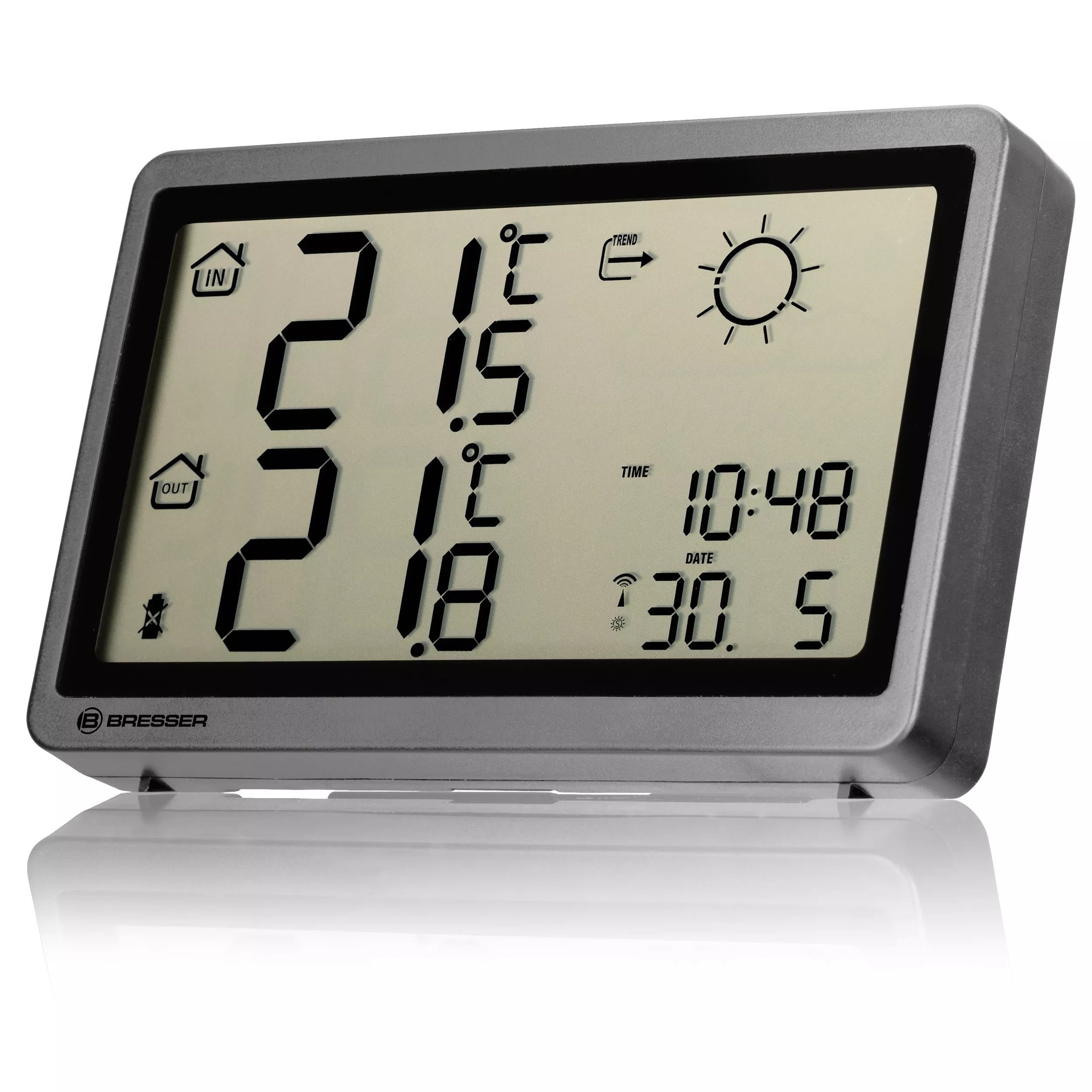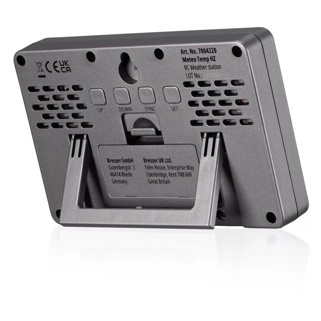 Behalten Sie auf der BRESSER Funkwetterstation MeteoTemp HZ mit Wettervorhersage, Temperatur, Datum und Uhrzeit das Wichtigste immer im Auge.