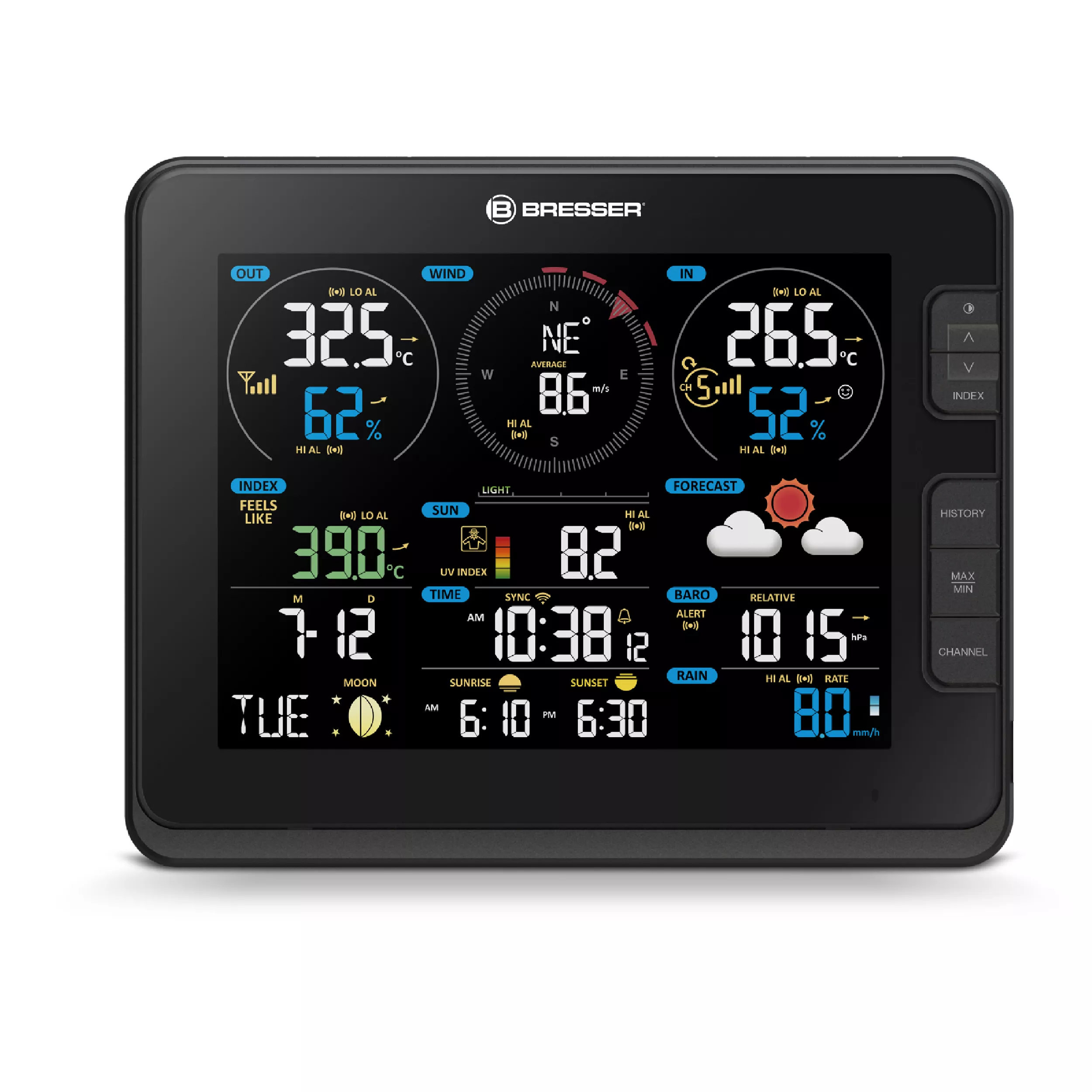 Gute Aussichten für passionierte Wetterfrösche: Verschaffen Sie sich mit der BRESSER Profi WLAN-Wetterstation 7-in-1 mit umfangreichen, selbst gemessenen Daten ganz einfach einen Überblick über Ihre lokale Wetterlage.
