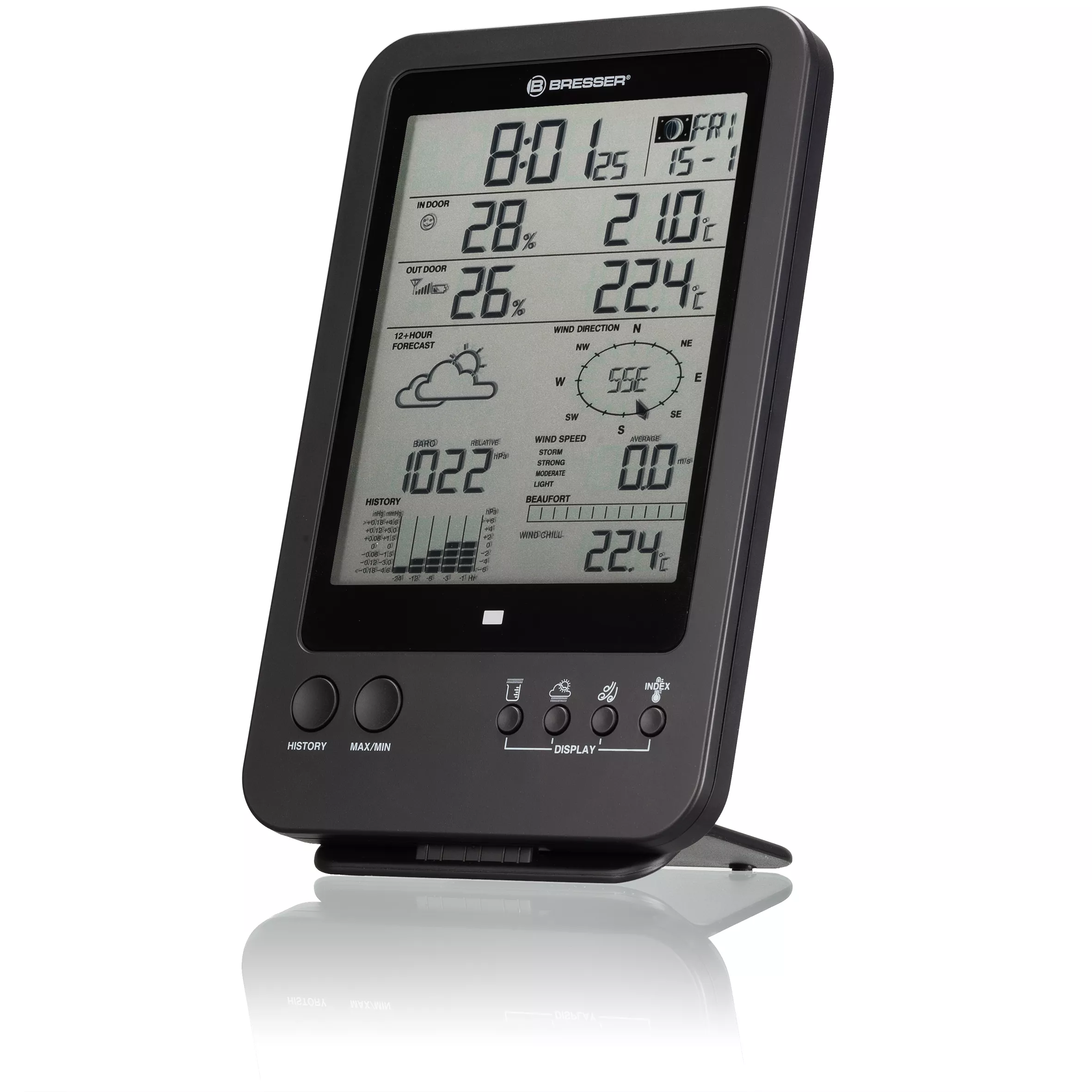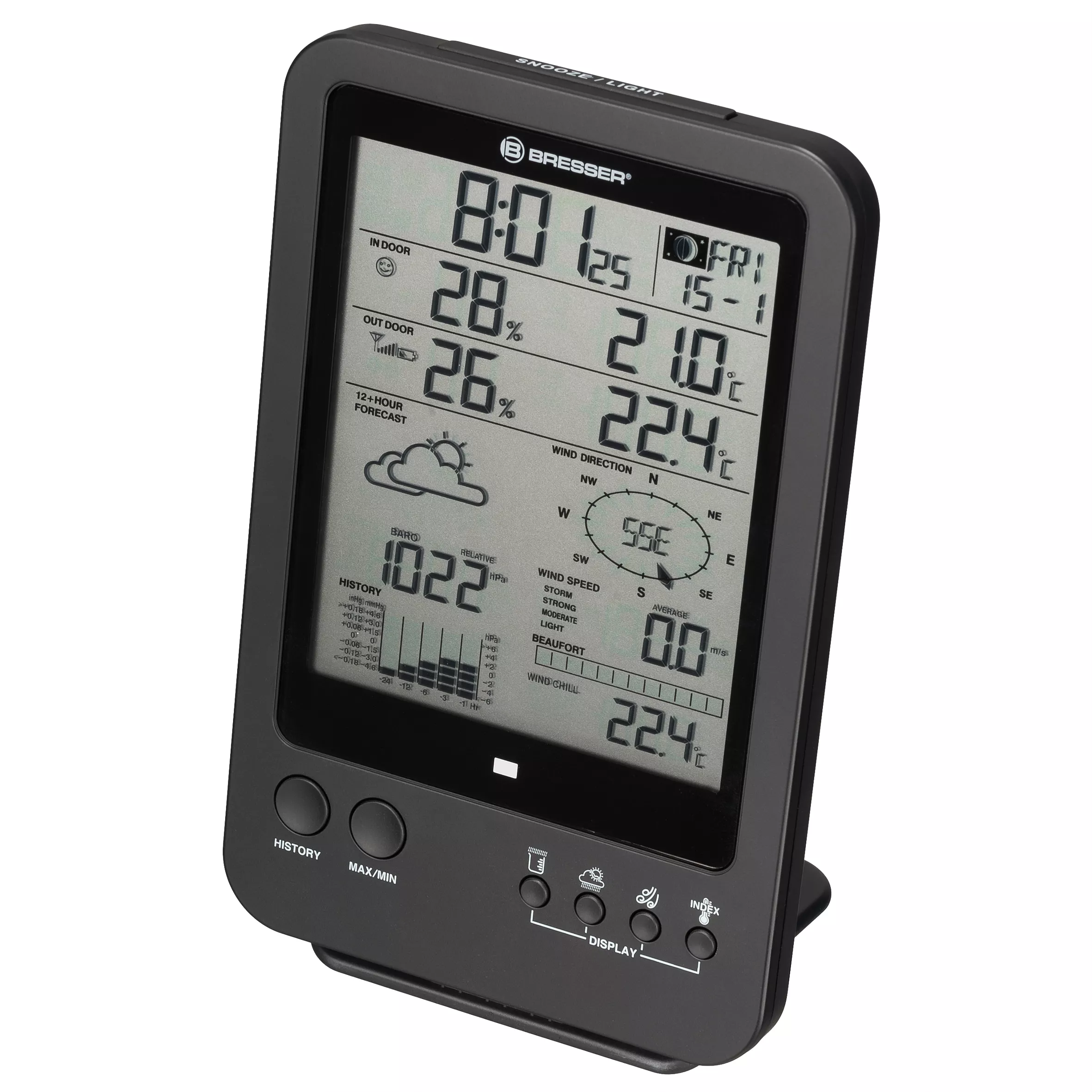 Ferner verfügt die BRESSER Wetterstation 5-in-1 über eine funkgesteuerte Zeit- und Datumseinstellung (DCF-Zeitsignal). Bereits wenige Minuten nach dem Einschalten werden automatisch die aktuelle mitteleuropäische Zeit (MEZ) und das Datum mit Tag angezeigt. Für alle Mondsüchtigen werden auch die verschiedenen Mondphasen angezeigt. Eine Weckfunktion mit Schlummerfunktion (Snooze) gehört ebenfalls zum Funktionsumfang.