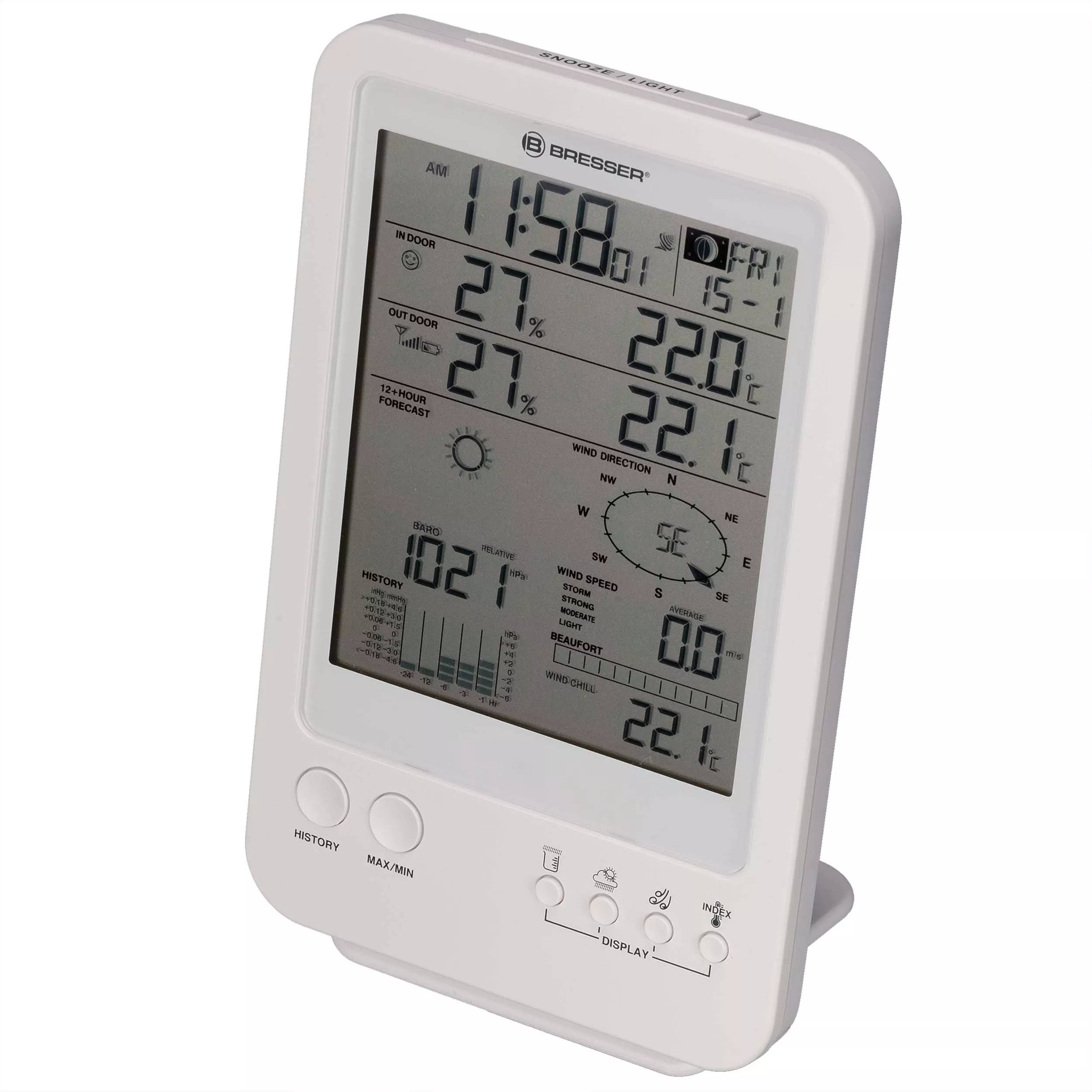 Ferner verfügt die BRESSER Wetterstation 5-in-1 über eine funkgesteuerte Zeit- und Datumseinstellung (DCF-Zeitsignal). Bereits wenige Minuten nach dem Einschalten werden automatisch die aktuelle mitteleuropäische Zeit (MEZ) und das Datum mit Tag angezeigt. Für alle Mondsüchtigen werden auch die verschiedenen Mondphasen angezeigt. Eine Weckfunktion mit Schlummerfunktion (Snooze) gehört ebenfalls zum Funktionsumfang.