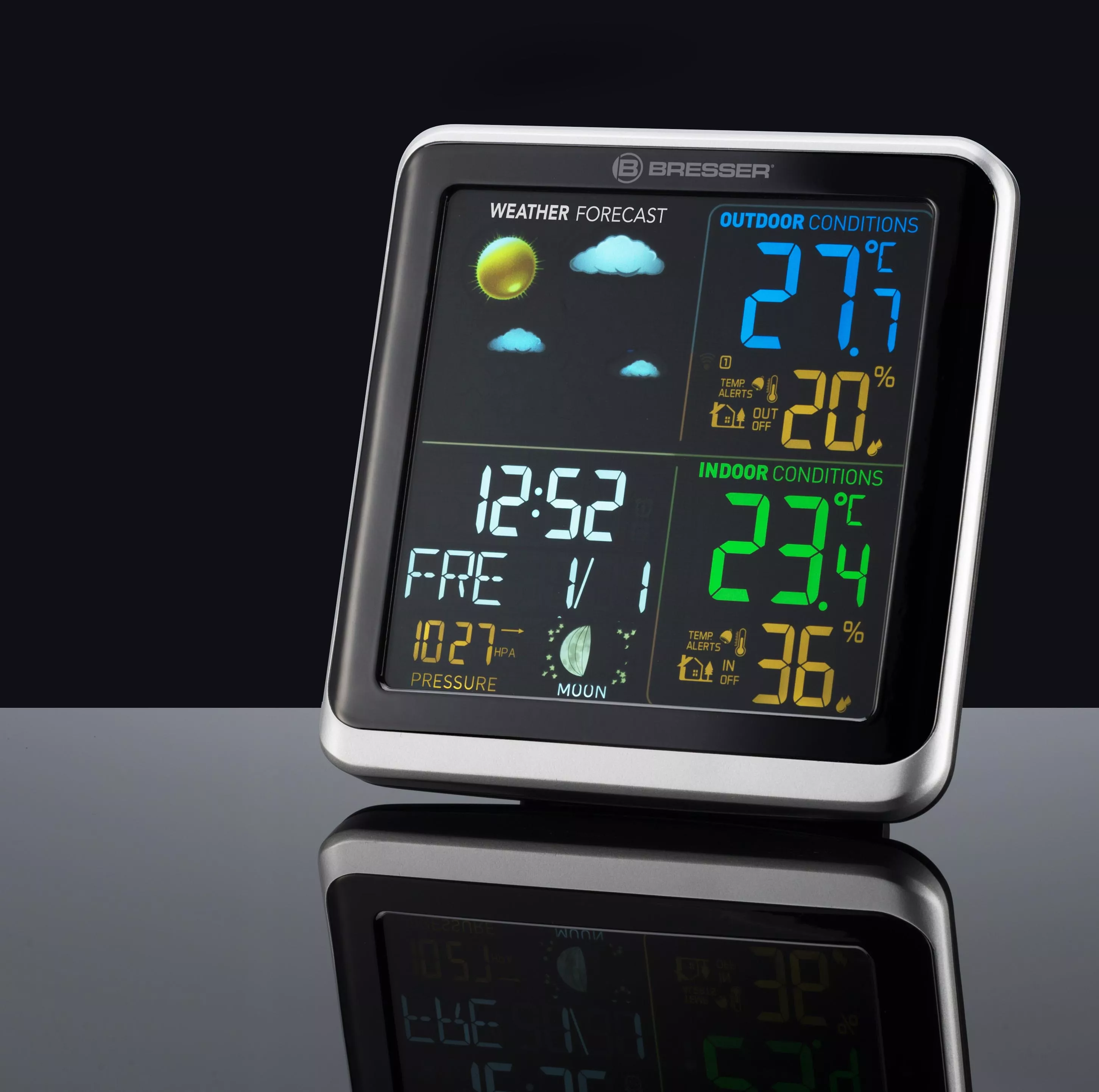 Diese BRESSER Wetterstation ClimaTemp TB hat ein übersichtlich gestaltetes Farbdisplay, welches in vier Bereiche eingeteilt ist.