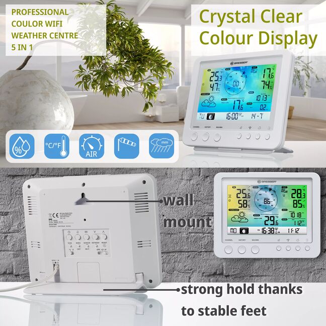 Die neue BRESSER WLAN Farbwetterstation mit 5-in-1 Profi-Sensor bietet trotz kompakter Bauweise einen umfassenden Informationsdienst. Der multifunktionale Profi-Außensensor lässt sich mit dem mitgelieferten Montagezubehör problemlos montieren!