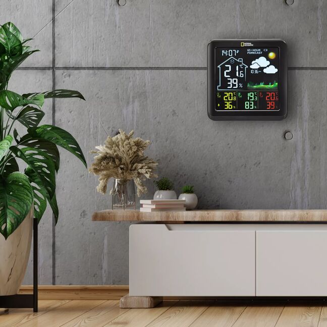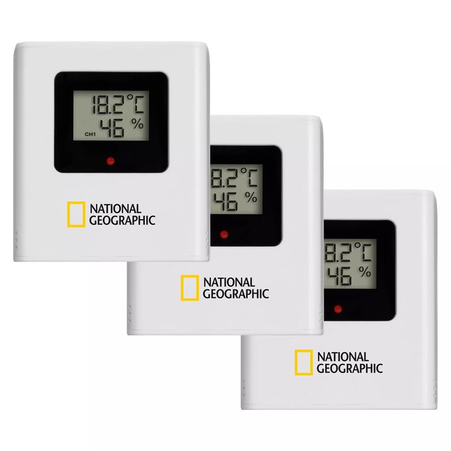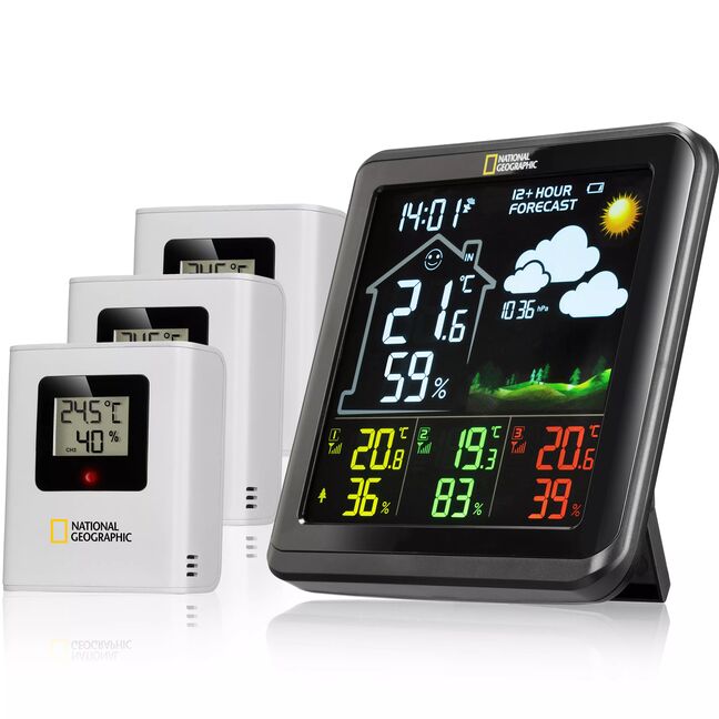 Die NATIONAL GEOGRAPHIC Farb-Wetterstation mit 4 Messbereichen in schwarz zeigt Ihnen alle wichtigen Wetterinformationen auf einen Blick. Im Lieferumfang sind standardmäßig 3 Thermo-/Hygro-Fernsensor enthalten, somit haben Sie nicht nur das Außenklima im Blick, sondern wenn Sie möchten auch das des Kinder-, Bade- oder Schlafzimmers oder zum Beispiel das Raumklima im Keller. Die Station ist sehr vielfältig einsetzbar, denn die Temperatur- und Luftfeuchtigkeitssensoren sind sowohl für innen wie außen geeignet. Auf dem übersichtlich gestalteten Farbdisplay finden Sie Informationen, wie z.B. die Temperatur und Luftfeuchtigkeit für innen und außen, sowie stets die genaue Uhrzeit per DCF-Funkübertragung und den aktuellen Wochentag. Überwachen Sie bis zu 4 unterschiedliche Orte auf Temperatur und Luftfeuchtigkeit und behalten Sie diese mit nur einem Gerät im Blick.
