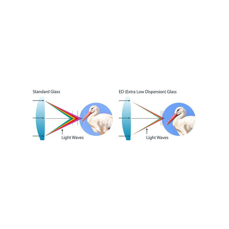 Extra Low Dispersion: Das ED-Glas mit extrem geringer Dispersion beseitigt praktisch die chromatische Aberration: es gibt keine störenden Farbsäume. Diese Farbkorrektur sorgt zudem für einen definierten Fokus und damit eine besonders hohe Schärfe und ein helles Bild. Vergleichen Sie die beiden Bilder auf der rechten Seite. Der Unterschied macht sich besonders bei schlechten Lichtverhältnissen bemerkbar, beispielsweise bei Dämmerung oder Sonnenaufgang.