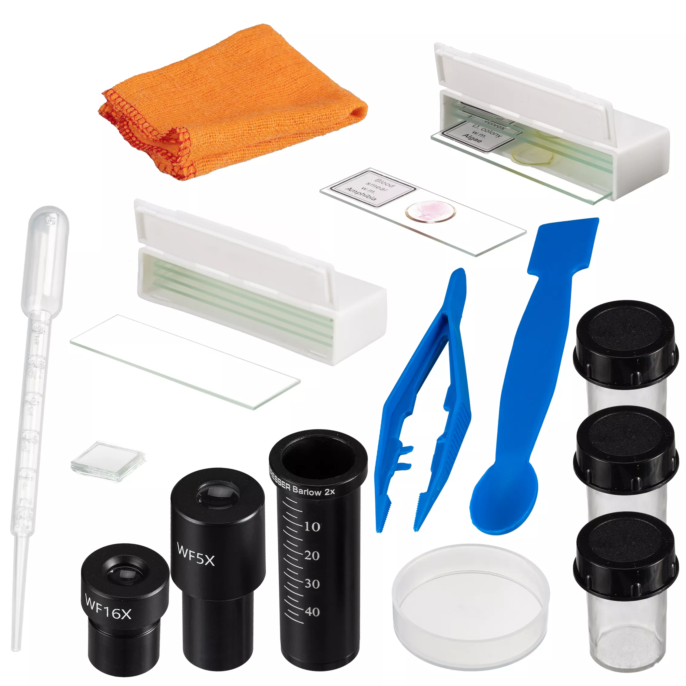 Um mit den Beobachtungen unmittelbar beginnen zu können, sind bereits fünf fertige Präparate im Lieferumfang enthalten. Außerdem ermöglichen die Objektträger und Deckgläser die Herstellung eigener Proben. Während des Mikroskopierens wird das jeweilige Präparat durch die Objektklemmen sicher gehalten. Eine Pinzette, eine Pipette, ein Spatel und eine kleine Schale gehören ebenfalls zum mitgelieferten Zubehör. Und mit dem Putztuch lässt sich alles ganz einfach sauber halten.