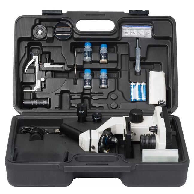 Die Spannungsversorgung erfolgt über Batterien (drei Stück Typ AA), so dass auch ohne Steckdose in der Nähe mikroskopiert werden kann. Neben der Staubschutzhülle sind im Zubehör schon 5 Dauerpräparate und 5 leere Objektträger und Deckgläschen zur Anfertigung eigener Präparate enthalten. Die Präparate kann man mit der im Lieferumfang enthaltenen hochwertigen HD Okularkamera auf dem PC-Monitor betrachten. Die beigefügte Windows-Software (Win 10 / 11 kompatibel) ermöglicht auch das einfache Aufnehmen von Fotos und Videos am PC. So kann jeder seine Ergebnisse dokumentieren oder mit anderen teilen!