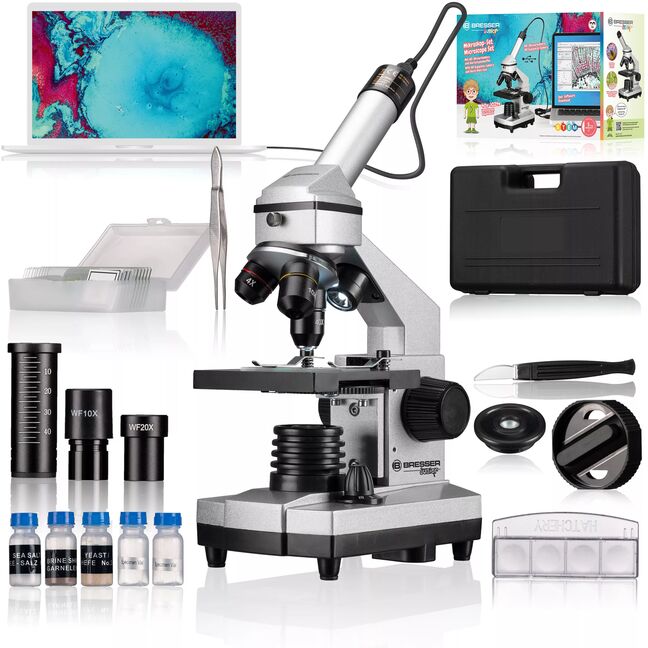 BRESSER JUNIOR - spielend die Welt der Optik erleben! Mehr als ein klassisches Mikroskop. Dieses Mikroskop-Set von BRESSER ist robust verarbeitet, flexibel einsetzbar und lässt sich an deinen Computer anschließen! Schenken Sie Kindern nicht nur ein Spielzeug, das schon bald in der Ecke liegen bleibt. Mit diesem Mikroskop-Set, das mit einem reichhaltigen Zubehör-Paket einen sofortigen Start in die Welt des Mikrokosmos ermöglicht, schenken Sie Kindern weit mehr als nur ein Spielzeug: Sie fördern das wissenschaftliche Arbeiten von Kindern und regen gleichzeitig den Erkundungsdrang an. Auf die Fragen, woraus bestimmte Dinge eigentlich bestehen, können Kinder mit diesem Mikroskop nun selbst erkunden, wie die Welt des Mikrokosmos aufgebaut ist.