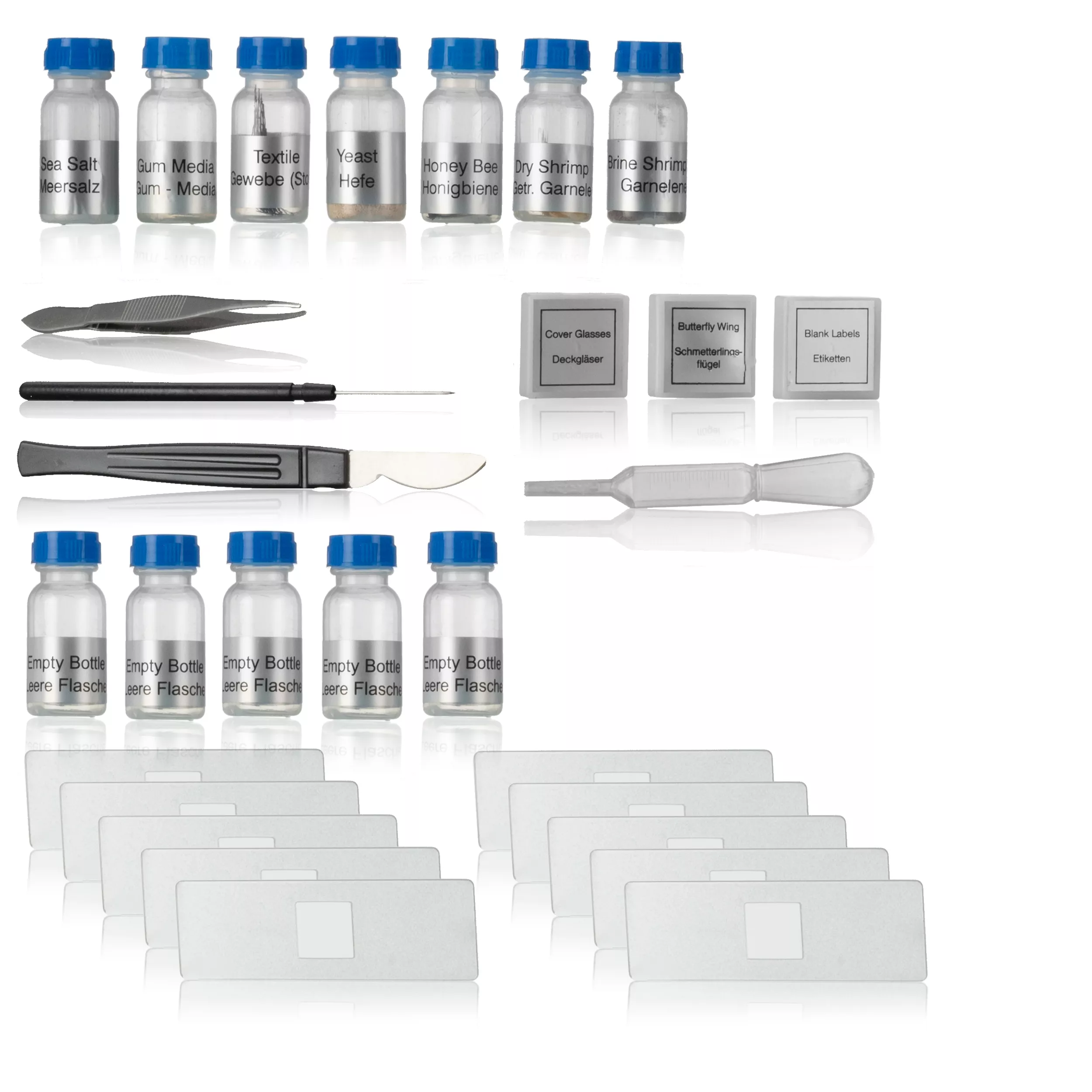 Deine ersten Erfolgserlebnisse in der Welt der Mikroskopie. Kein Problem mit unserem umfangreichen Experimentierset. Es beinhaltet eine Vielzahl von nützlichen Zubehörteilen fürs Mikroskopieren wie Pipette, Lupe, alles für die Aufzucht von Urzeitkrebsen (Artemia), Objektträger, Deckgläser und vieles mehr!