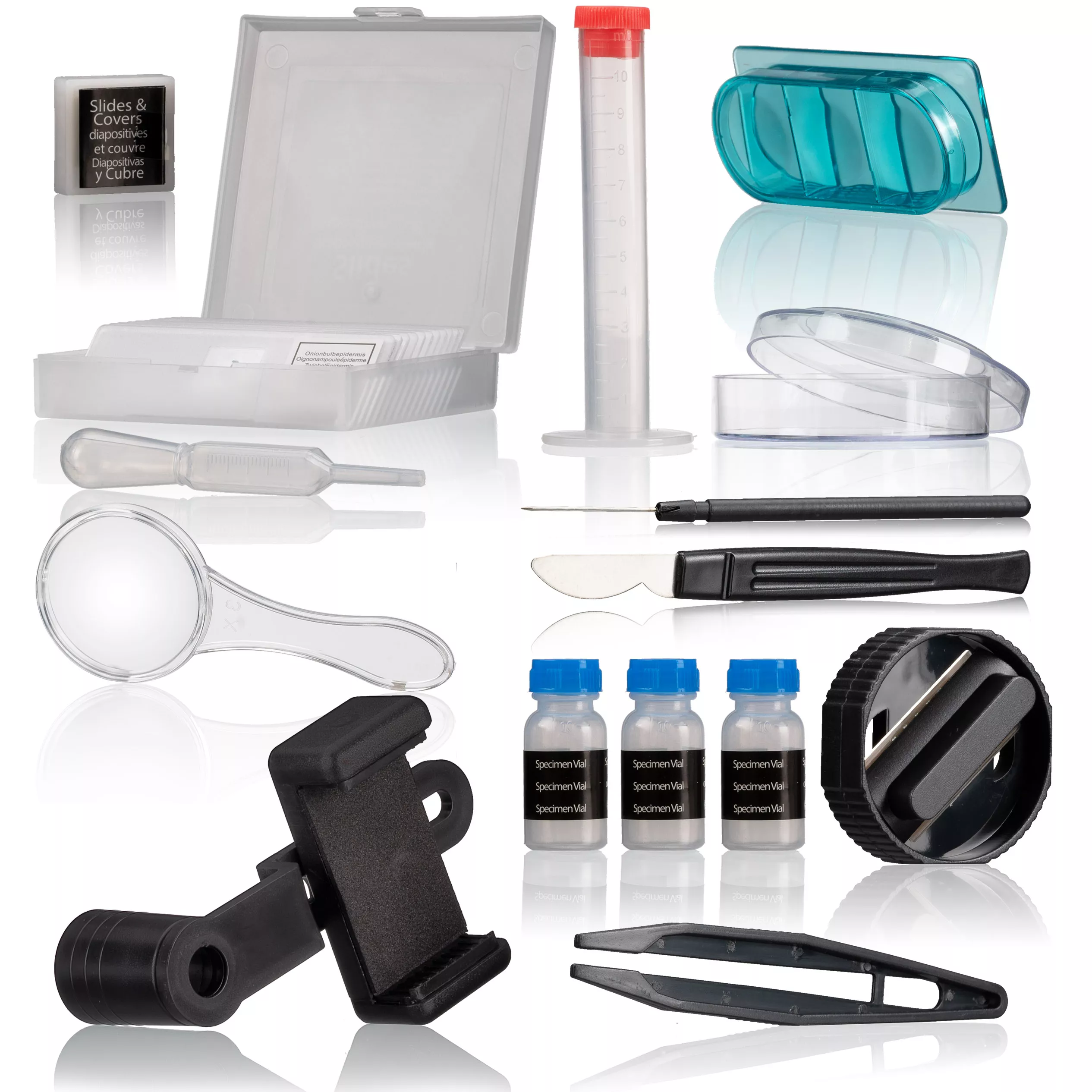 Für die Beobachtung beispielsweise von Zellstrukturen, bspw. einer Zwiebelhaut benötigt man neben einer entsprechend hohen Vergrößerung zunächst einmal hauchdünne Proben, sodass das Licht hindurchscheinen kann. Aber keine Sorge, für den Anfang sind im Set bereits ein paar Dauerpräparate enthalten und zusätzlich das nötige Zubehör, um selbst weitere vorzubereiten.