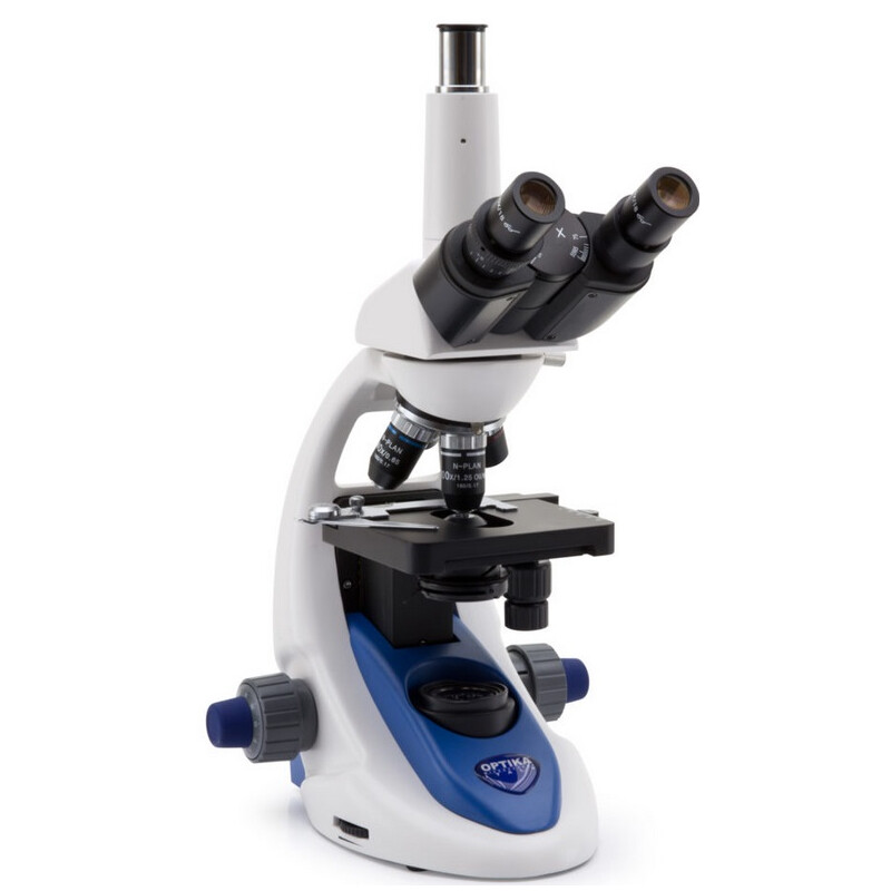 Trinocular microscope for camera connection ideal for teachers and secondary schools, with four N-PLAN objectives (1000x), FN 18 high eyepoint, finite optical system, coaxial focusing, mechanical stage, Abbe condenser and powerful, uniform, white color temperature 3 W X-LED2 illumination. Slim and easy to carry, yet sturdy and resistant, it is equipped with all the main controls to start learning how to use an advanced microscope and with long lasting LED illumination to provide over 20 years of use