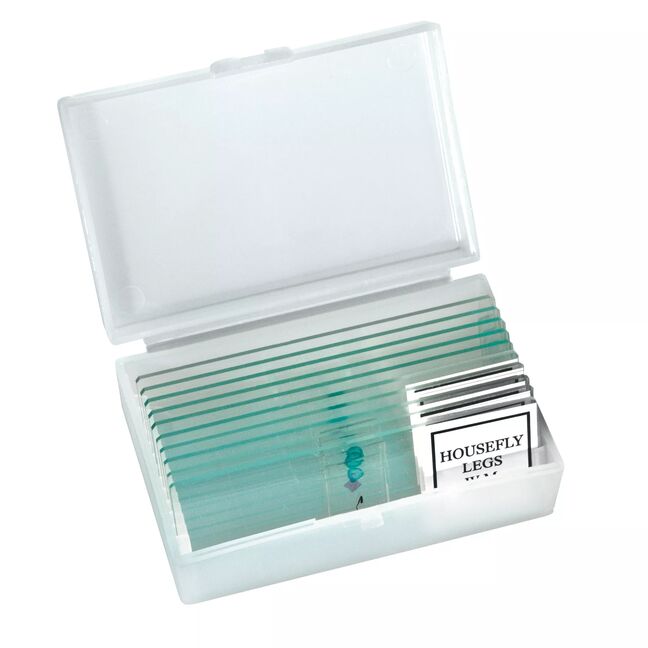 - Kunststoffbox mit 5 Objektträgern, 10 Deckgläsern, 5 Dauerpräparaten