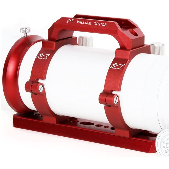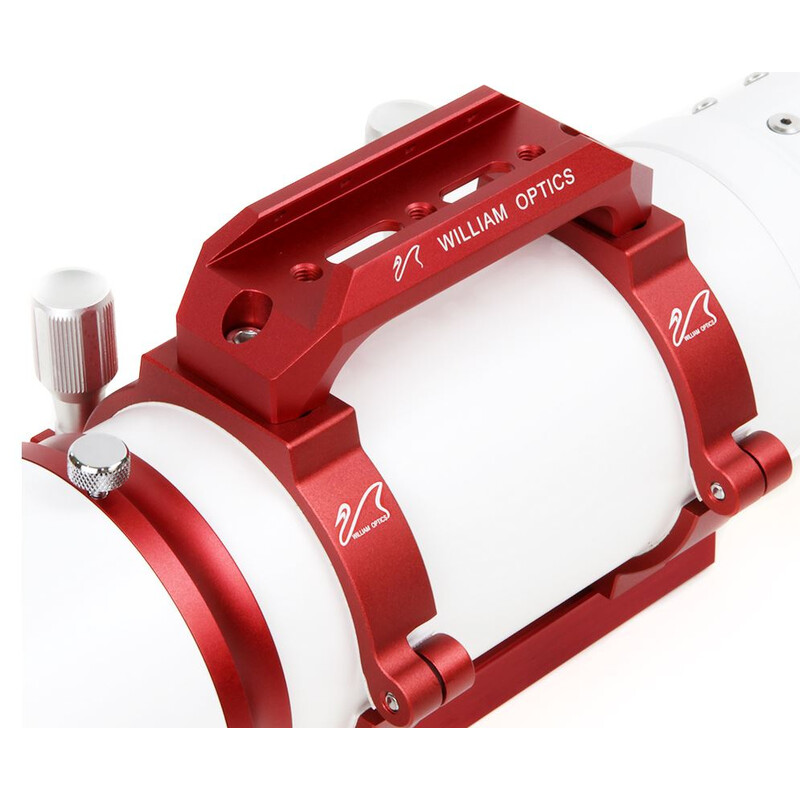 Der Tragegriff verfügt über eine Aufnahme der Leitrohrschellen oder des Sucherfernrohrs mit Prismenschiene von William Optics.