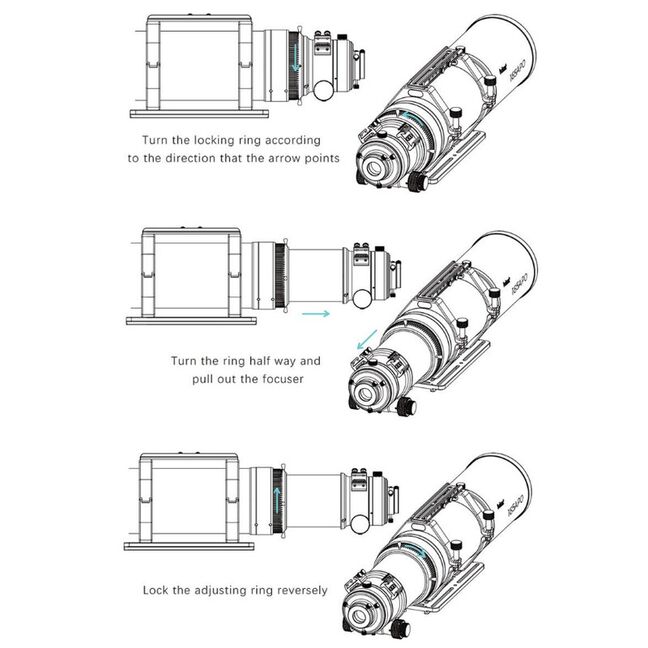 Integrierte Tubusverlängerung: Der Tubus besitzt eine integrierte Verlängerung, die je nach Bedarf ausgezogen oder eingeschoben werden und mit einem Klemmring arretiert werden kann. Dadurh kann der APO nicht nur fotografisch, sondern auch visuell genutzt werden. Der Arbeitsabstand ist groß genug für das Verwenden eines Zenitspiegels und Binoansatzes.
