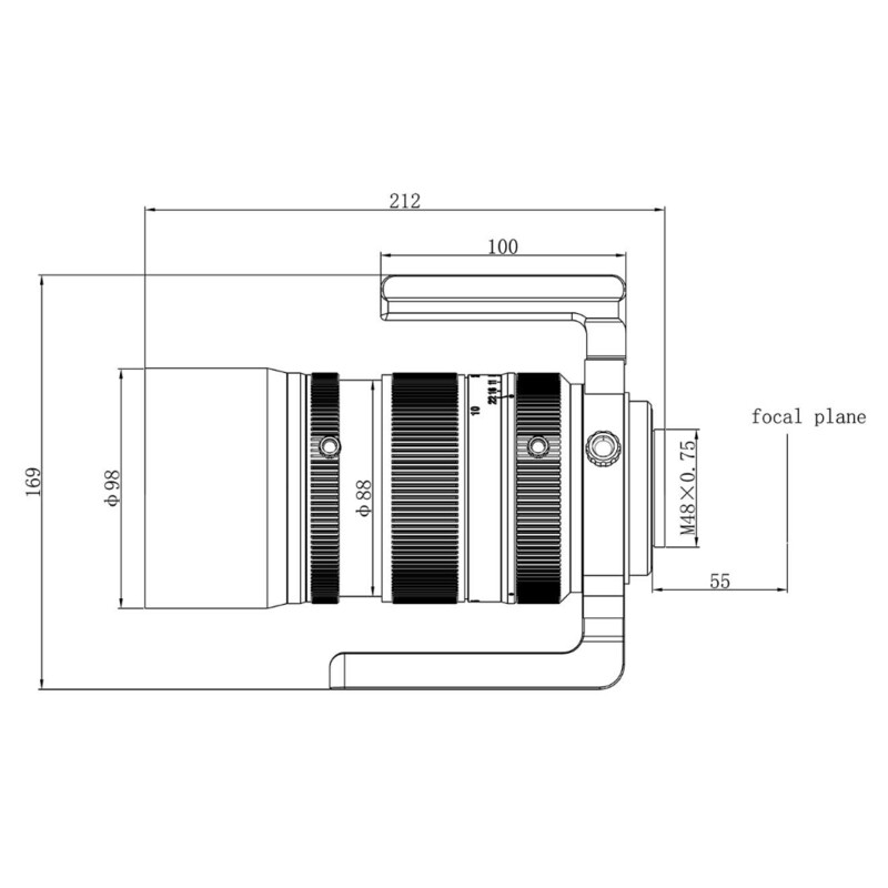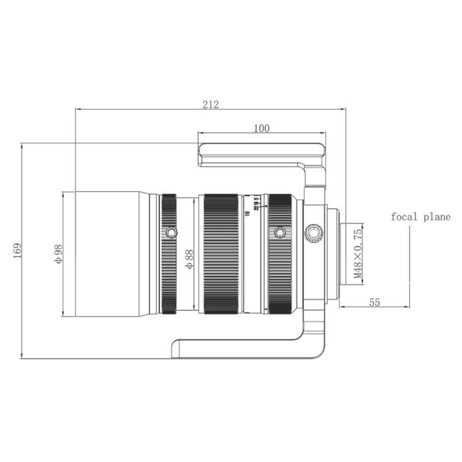 - Der Apo hat an der Kameraseite ein M48x0,75-Anschlussgewinde mit einem Arbeitsabstand von 55 Millimeter bis zur Kamera. Damit können Sie alle gängigen Kameras mit dem geeigneten T-Ring anschließen.