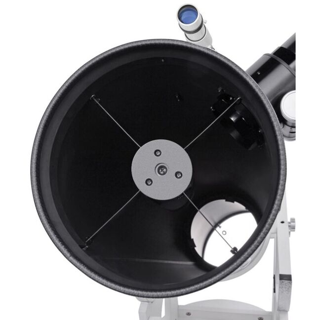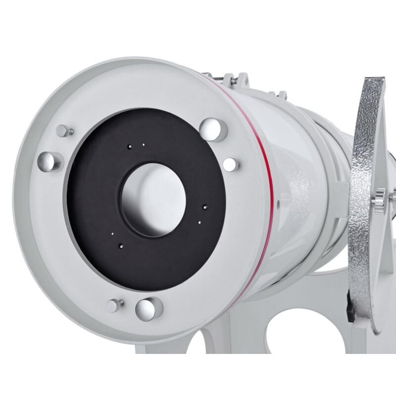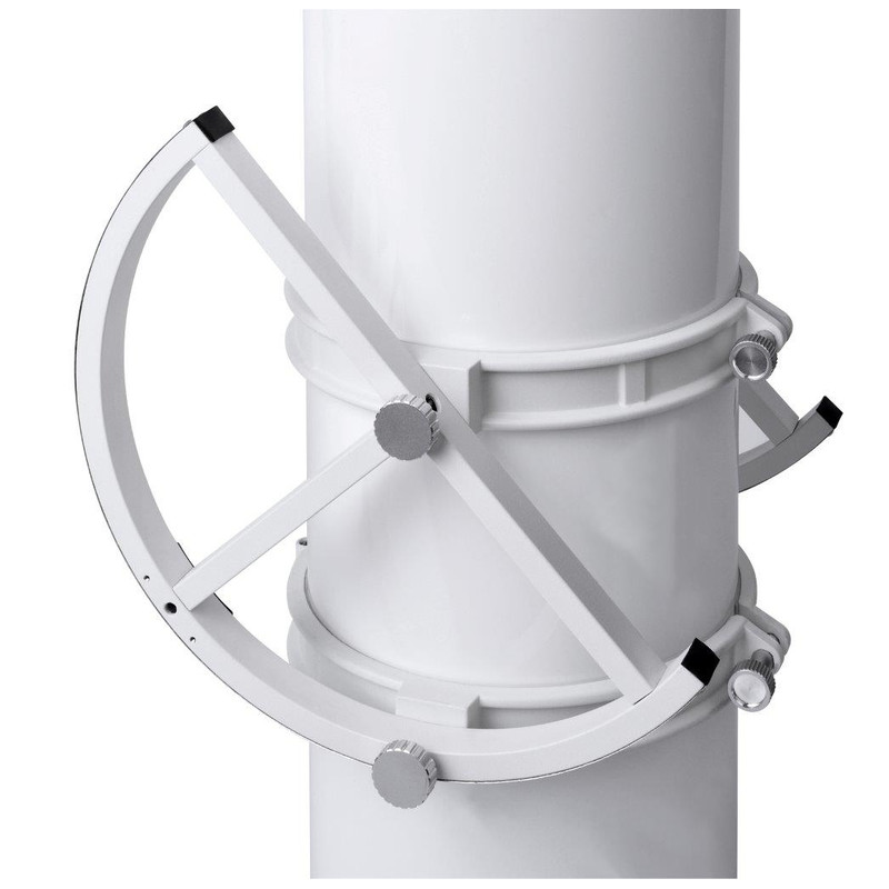 - Der optische Tubus sitzt in einem Rohrschellenpaar, das auf den Seiten die großen Höhenräder trägt. So kann der Tubus problemfrei auch auf einer parallaktische Montierung verwendet werden und auch entlang seiner Längsachse gedreht werden, um in jeder Position den idealen Okulareinblick zu gewähren. Durch Verschiebung des Tubus innerhalb der Rohrschellen kann das Dobson optimal austariert werden.
