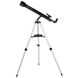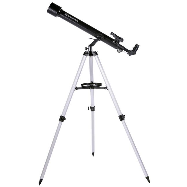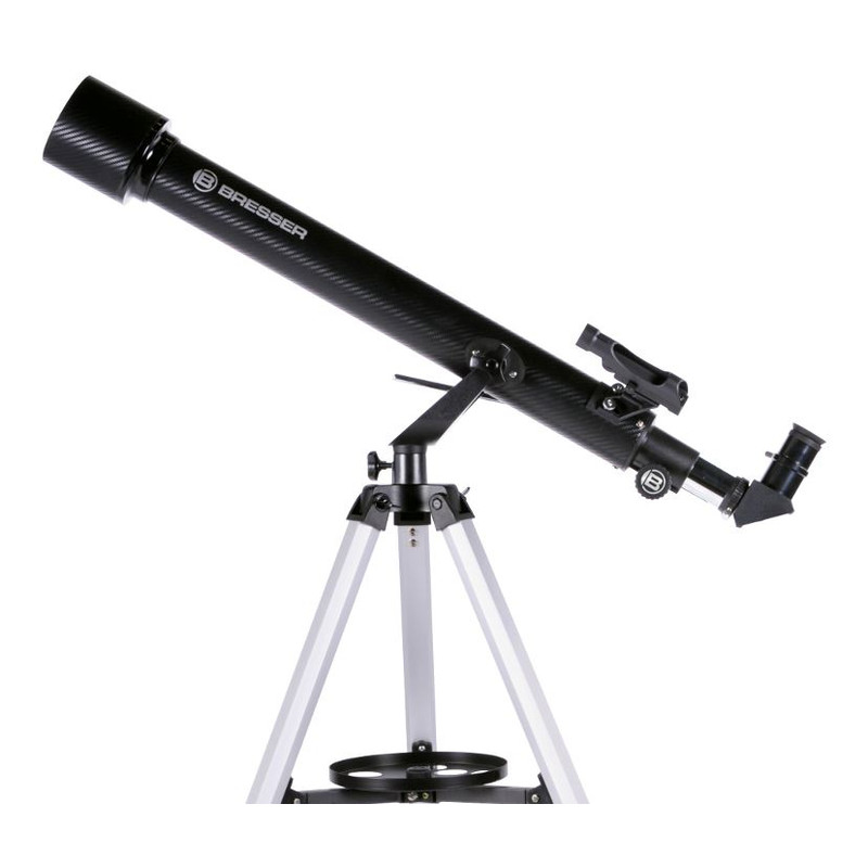 Die Optik AC 60/700: Dieser Refraktor sammelt mit einer Öffnung von 60mm bereits 70 mal so viel Licht wie das bloße Auge und gehört damit zu den klassischen Einsteigerteleskopen. Mit einer maximalen Vergrößerung von 120x zeigt es schon erste Details bei der Beobachtung der großen Planeten Saturn, Jupiter und Mars. Auch der Mond ist ein sehr lohnendes Objekt: Man kann wunderschön die Kraterlandschaft des Mondes beobachten, die je nach Phase immer in einem anderen Licht erscheint. Auch interessante Naturbeobachtungen bei Tageslicht sind mit einer Umkehrlinse oder mit einem Amici Prisma möglich. Die Fokussierung erfolgt mittels eines Einstellrades am Okularauszug, das diesen über eine Zahnstange antreibt. So lässt sich die Schärfe immer genau einstellen und bleibt während der Beobachtung zuverlässig fixiert.