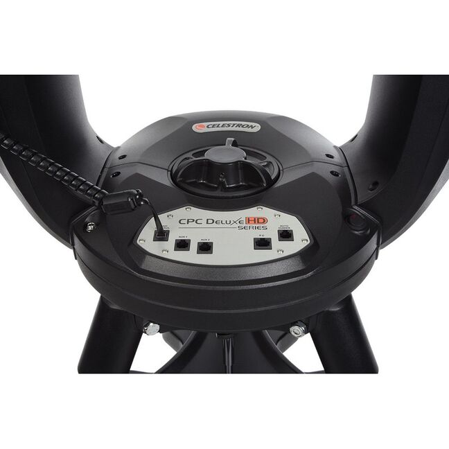 Die Montierung Celestron CPC: Die Schmidt-Cassegrain-Optiken der CPC-Serie sind fest in einer stabilen Gabelmontierung aus Aluminiumguss eingebaut. Die Optik kann also nicht ausgewechselt werden. Dieser Nachteil wird aber durch die kompakte Abmessung, der Verzicht auf schwere Gegengewichte und die sehr gute Transportierbarkeit ausgeglichen. Der größte Vorteil ist jedoch die unglaublich schnelle Aufstellung und Justage. Sie sind in wenigen Minuten bereit zur Beobachtung, wenn andere noch schrauben und justieren: Einfach das Stativ in der gewünschten Auszugshöhe für sitzende oder stehende Beobachtung aufstellen, mit der eingebauten Dosenlibelle nivellieren, die Gabelmontierung aufsetzen (rastet mittig ein), mit den drei federunterstützten Stativschrauben sichern - und einschalten.