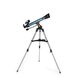Dieser Refraktor sammelt mit einer Öffnung von 70mm bereits 100 mal so viel Licht wie das bloße Auge und damit auch wesentlich mehr Licht als klassische Einsteigerteleskope mit einer nur geringfügig kleineren Öffnung von 60mm. Somit besitzt es auch ein höheres Auflösungsvermögen und zeigt Ihnen mit einer maximalen Vergrößerung von 140x schon erste Details bei der Beobachtung der großen Planeten Saturn, Jupiter und Mars. Auch der Mond ist ein sehr lohnendes Objekt: Man kann wunderschön die Kraterlandschaft des Mondes beobachten, die je nach Phase immer in einem anderen Licht erscheint. Auch interessante Naturbeobachtungen bei Tageslicht sind mit einer Umkehrlinse oder mit einem Amici-Prisma möglich. Die Fokussierung erfolgt mittels eines Einstellrades am Okularauszug, das diesen über eine Zahnstange antreibt. So lässt sich die Schärfe immer genau einstellen und bleibt während der Beobachtung zuverlässig fixiert.