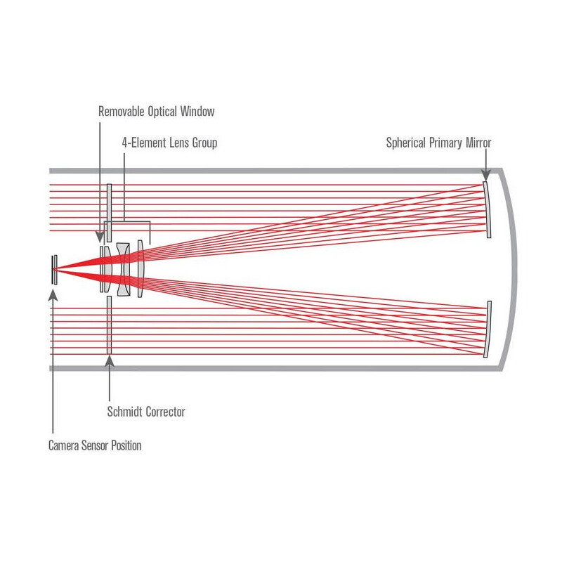 Der Rowe-Ackermann Schmidt Astrograph wurde als vollständiges System für die Astrofotografie entwickelt und liefert mit DSLR- und astronomischen CCD-Kameras die besten Ergebnisse. Jedes Element bis hin zur Dicke des Glases im vollständig mehrfachvergüteten optischen Fenster oder optionalen Filtern wurde jede Komponente des Systems berücksichtigt und aufeinander abgestimmt.