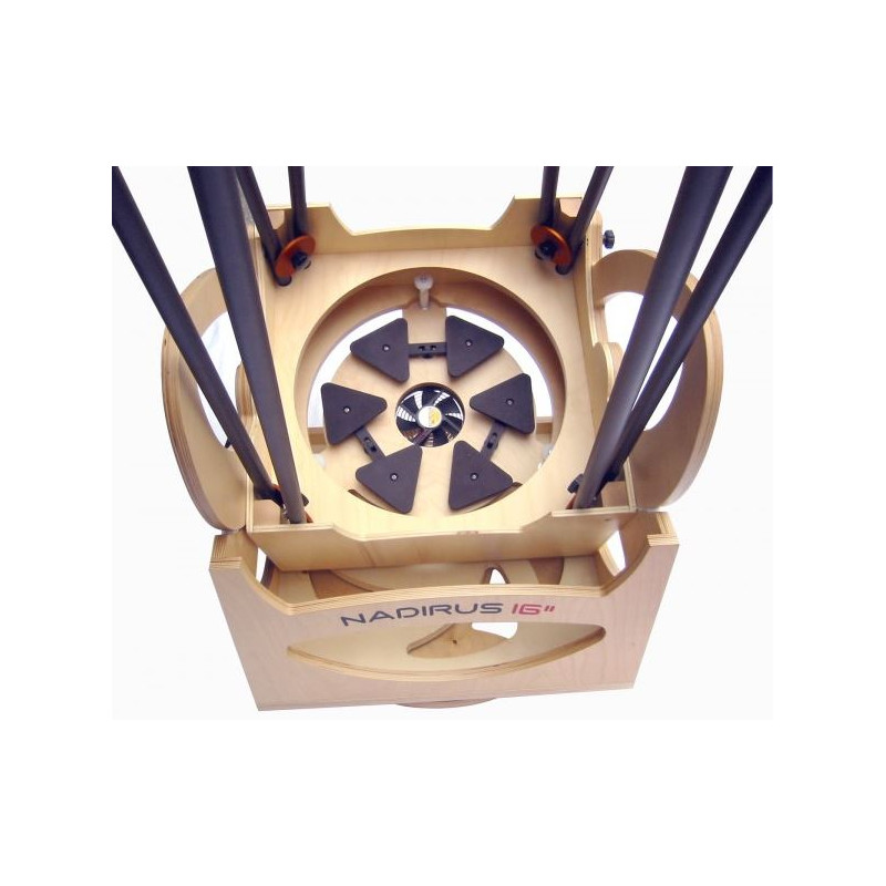 We privileged a structure in lamellar beech wood which makes it stable and lightweight. In particular, it has been taken care of the upper cylinder housing is where the spider secondary mirror holder which was made of birch plywood crossed beams that give the piece a unique strength and stability. Although the primary mirror cell is made of birch plywood with a support system where the 9-point floating mirror rests on discs of natural cork foam.
