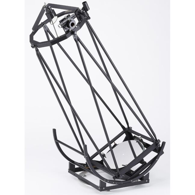 - Durchdacht konstruierte Spiegelfassung: Das Dobson-Teleskop verfügt über ein umfassend stabilisiertes und optimiertes Schwebesystem, das den Spiegel mehr als ausreichend stabilisiert. Das Dreipunkt-Lager zur Kollimation ist von der stabilisierenden, lateralen Halbschlinge gänzlich getrennt. Hierdurch wird der oft anzutreffende Kartoffelchip-Astigmatismus vollständig entfernt, welcher bei der Verwendung eines einfachen Kollimationssystems mit 3 Kollimations-Schrauben durch die Halbschlinge entsteht. Bei einem einfachen Kollimationssystem kann die Kollimation des Primärspiegels dazu führen, dass die Halbschlinge den Spiegel axial an der Spiegelkante anzieht, wodurch der Spiegel zu einer Kartoffelchip ähnlichen Form gebogen wird, was zu einem störenden Astigmatismus führt.