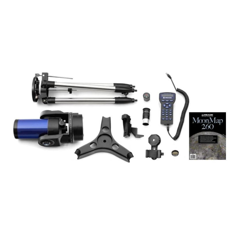 - Als elektronische Steuerung dient die im Lieferumfang enthaltene sehr bewährte Handbox. Die Software kann, ohne heimischen PC oder Laptop, eine große Anzahl von Objekten am Sternenhimmel automatisch anfahren und nachführen, so dass das Objekt der Begierde trotz Erddrehung immer im Blickfeld bleibt.