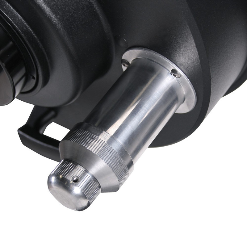 Zero-Image-Shift Mikrofokussierer: Die Scharfstellung des Bildes erfolgt über die Hauptspiegelfokussierung. Diese ist so konstruiert, dass es nicht zu einer Verkippung des Spiegels kommen kann. Die Fokussierung erfolgt feinfühlig mit einer 1:7-Untersetzung über einen sehr griffigen Hebel. Die Modelle mit 14"- und 16"-Öffnung (355mm und 406mm) sind zusätzlich mit einer speziellen Fixierung ausgestattet. so bleibt selbst bei diesen schweren Spiegel der eingestellte Fokus erhalten.