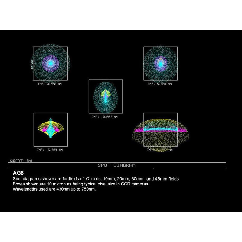 - Wynne-Korrektor: Das Design des AG-Korrektors wurde nach Monaten an Rechnung und Feldtests mit unterschiedlichen Kameras und Teleskopen festgelegt. Er wird nicht nur bei den AG-Modellen verwendet, sondern arbeitet such unglaublich gut bei den Teleskopen anderer Hersteller mit andferen Spiegelgrößen und Öffnungsverhältnissen. Der Korrektor, welcher das Bild auf das 0,95-Fache verkleinert, besteht aus 4 Elementen aus Spezialgläsern, angeordnet zu zwei einzelnen Linsen und einem verkitteten Dublett. Dadurch wird das Licht vom Teleskop auf eine flache Bildebene von 60 mm Durchmesser gebraucht, ohne Farbfehler. Die Grundlage des Designs ist der Einsatz einiger Gläser mit seltenen Erden und die computergestützte Wahl der Krümmungsradien der Linsen. Durch den aufwendigen Aufbau können selbst weltbekannte Astrofotografen keinerlei Fehler mehr auf den Bildern finden.