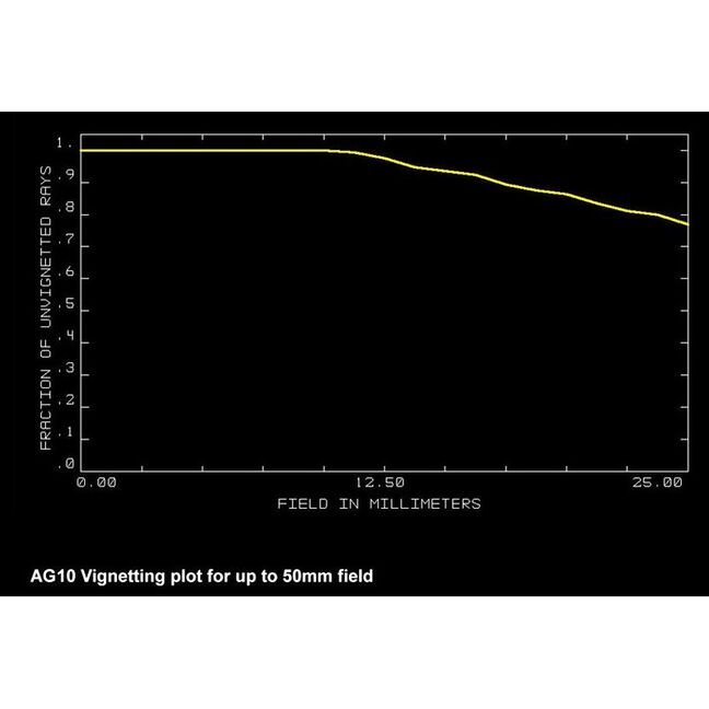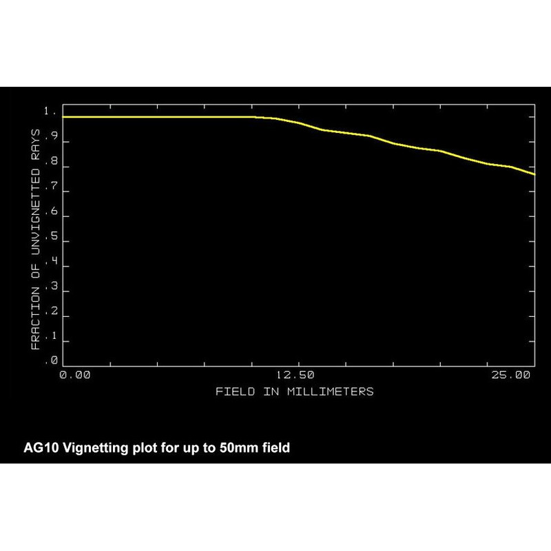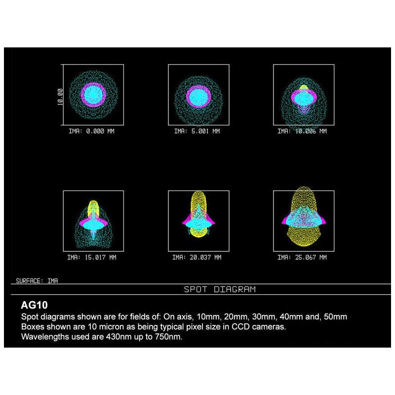 • Wynne-Korrektor: Das Design des AG-Korrektors wurde nach Monaten an Rechnung und Feldtests mit unterschiedlichen Kameras und Teleskopen festgelegt. Er wird nicht nur bei den AG-Modellen verwendet, sondern arbeitet such unglaublich gut bei den Teleskopen anderer Hersteller mit andferen Spiegelgrößen und Öffnungsverhältnissen. Der Korrektor, welcher das Bild auf das 0,95-Fache verkleinert, besteht aus 4 Elementen aus Spezialgläsern, angeordnet zu zwei einzelnen Linsen und einem verkitteten Dublett. Dadurch wird das Licht vom Teleskop auf eine flache Bildebene von 60 mm Durchmesser gebraucht, ohne Farbfehler. Die Grundlage des Designs ist der Einsatz einiger Gläser mit seltenen Erden und die computergestützte Wahl der Krümmungsradien der Linsen. Durch den aufwendigen Aufbau können selbst weltbekannte Astrofotografen keinerlei Fehler mehr auf den Bildern finden.