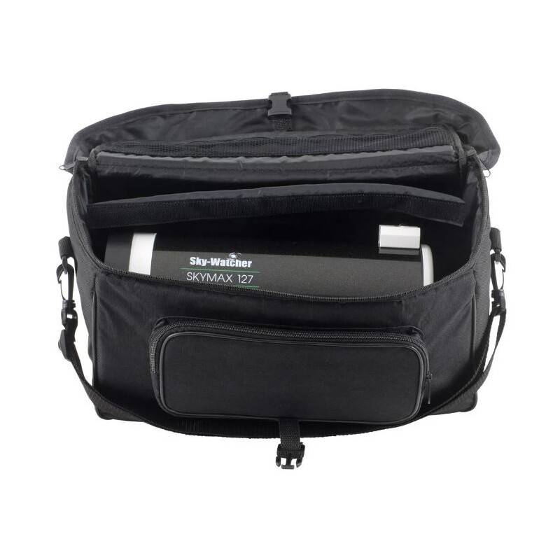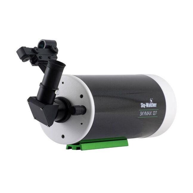 Mit 127mm Öffnung ist die Maksutov Cassegrain Optik bereits sehr lichtstark und sammelt etwa doppelt so viel Licht wie ein 90mm Teleskop. Obwohl die Baulänge des Tubus auf nur 33cm gehalten werden konnte, verfügt er bauartbedingt über eine Brennweite von 1540mm. Dies ermöglicht eine besonders kontrastreiche Planetenbeobachtung und zahlreiche erkennbare Details. Selbst den meisten Deep Sky Beobachtungen steht nichts im Wege. Die Lichtsammelfähigkeit liegt 329fach höher als die eines dunkeladaptierten Auges mit 7mm AP. Als Spektiv für Naturbeobachtungen bietet die Optik eine passende Alternative zum kleinen Preis. Viele klassische Spektive ermöglichen erst im hochwertigen Bereich für mehrere hundert Euro eine feste Kameraadaption. Ganz anders verhält es sich bei diesem Teleskop: Es sind zahlreiche Adaptionen für die Naturfotografie erhältlich. Bei 1540mm Brennweite kann z.B. Vogelfotografie im Lowcost-Bereich betrieben werden. Ein integriertes T-2 Gewinde lässt ganz einfach eine SLR Kamera anschließen. Natürlich kann man auch im Astrofotobereich Mondaufnahmen anfertigen. Die Schärfe lässt sich mit einem seitlichen Drehknopf einstellen. Dabei verschiebt sich der Hauptspiegel rückwärtig oder in Frontrichtung. Diese Mechanik ermöglicht einen großen Bereich für die Scharfstellung und bietet zahlreiche Adaptionsmöglichkeiten. Auch rein äusserlich betrachtet ist die Optik ein echtes Schmuckstück: Sie besticht durch ein elegantes Design der Extraklasse, Tubus und Sucherfernrohr schimmern in einem ästhetischen Schwarzton.