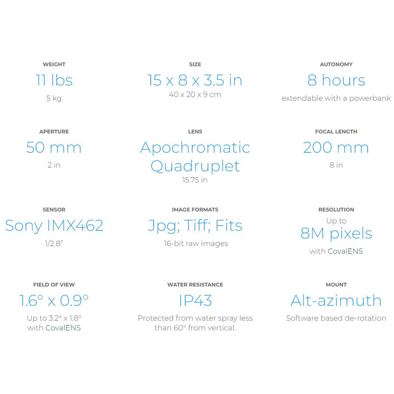 Hochempfindlicher Sony-Sensor: Vespera verwendet einen der neuesten Sony-Sensoren, der für extrem schwaches Licht entwickelt wurde. Sein back-illuminated CMOS-Sensor bietet ein 1/2,8-Format und eine Pixelgröße von 2,9 um. Vaonis hat auch eine eigenes elektronische Board entwickelt, um ein optimales Wärmemanagement zu gewährleisten. Ein heißer Sensor bedeutet eine Menge Bild-Defekte, daher ist die Sensorplatine so konzipiert, dass sie ein Maximum an Wärme ableitet.