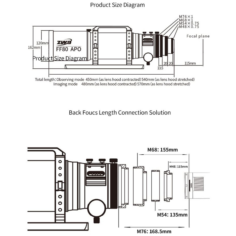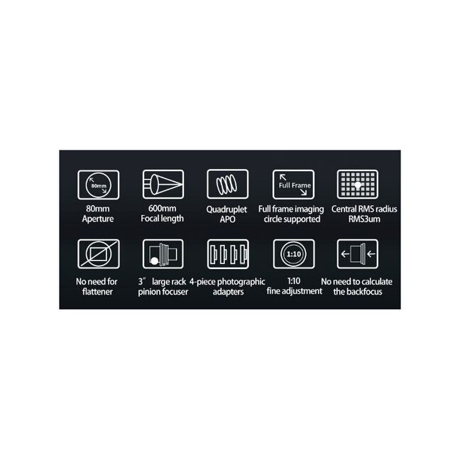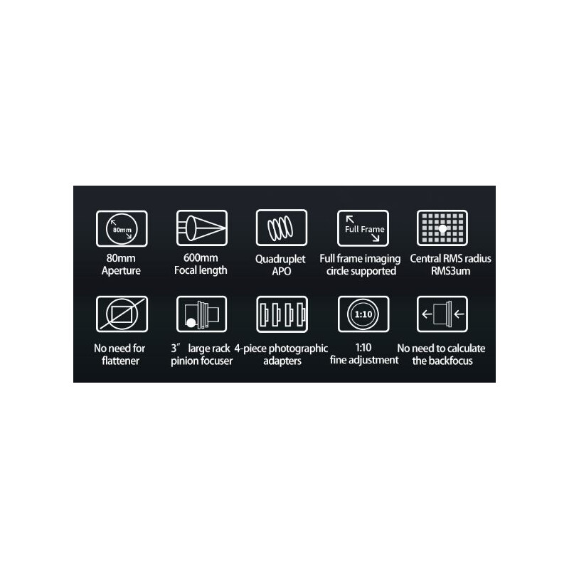 Der ZWO FF80 Quadruplet ist ein sehr kompakter apochromatischer Refraktor für die Astrofotografie mit einem korrigiertem Bildfeld bis Vollformat und die Beobachtung bis in den höchsten Vergrößerungsbereich. Das Teleskop hat ein Öffnungsverhältnis von f/7,5 bei einer Brennweite von 600mm. Der FF80 ist ein Quadruplet-Design mit zwei ED-Gläsern, was eine hervorragende Unterdrückung von chromatischer Aberration ermöglicht.