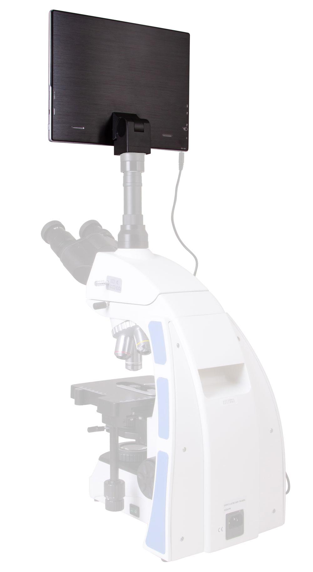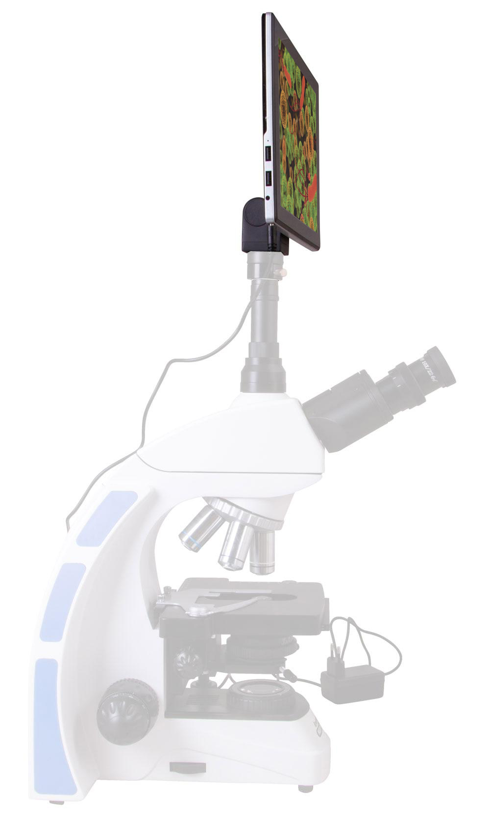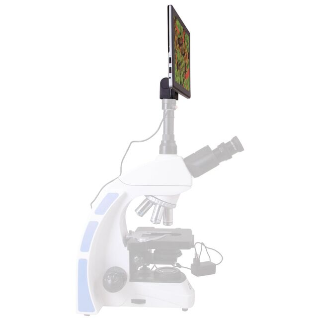 Die Kamera lässt sich dank Standarddurchmesser problemlos in einem Okulartubus mit 23,2 mm Durchmesser installieren. Wir raten von einem Einsatz der Kamera mit Monokular- oder Binokularmikroskopen ab, da der Bildschirm relativ schwer ist, Kamera und Mikroskop aufgrund der Hebelwirkung kippen können. Verwenden Sie die Kamera am besten mit Trinokularmodellen mit separatem Vertikaltubus. Zum Anbringen der Kamera am Okulartubus wird ein Montageadapter (separat erhältlich) benötigt.